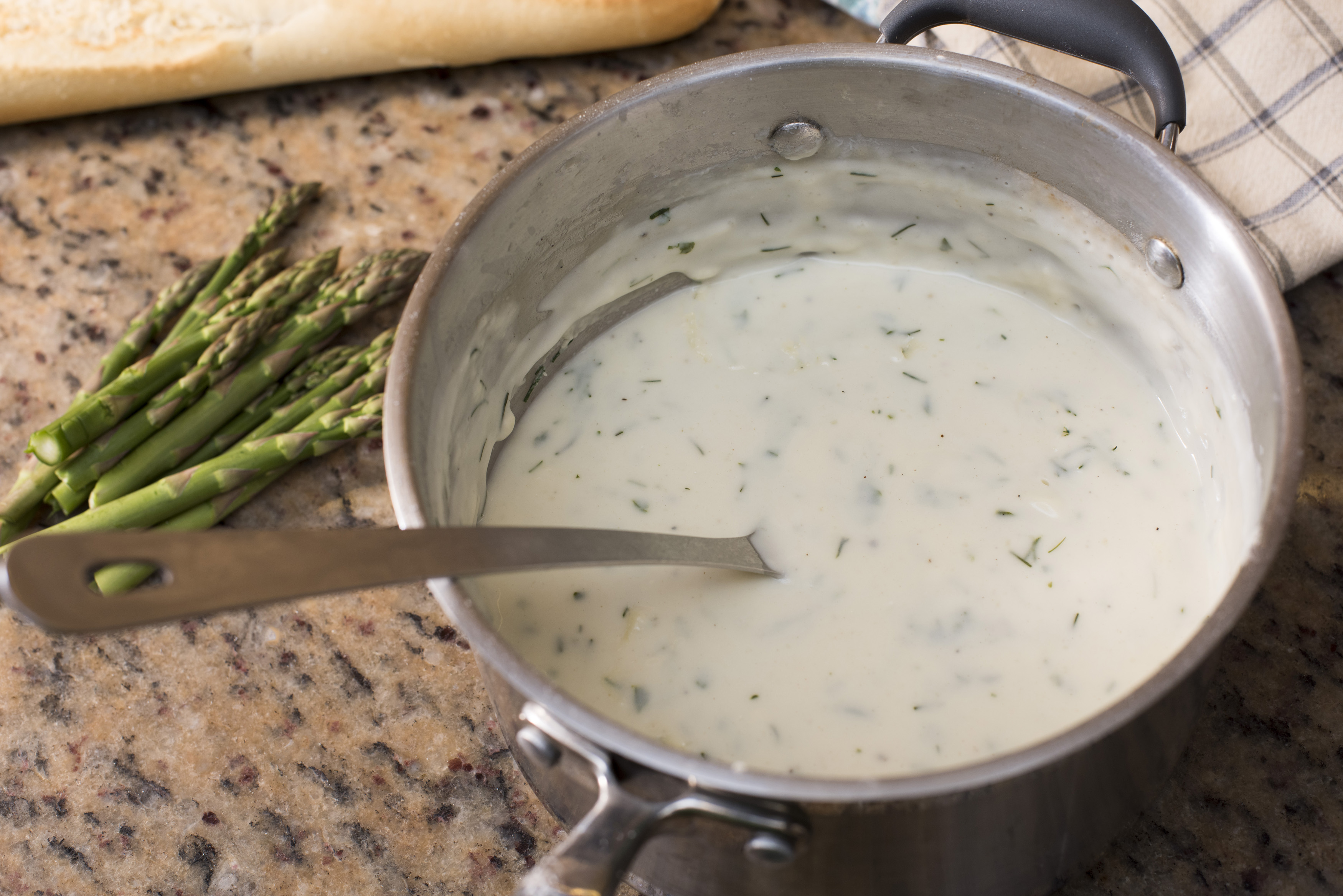 Stainless steel pot with herbed white sauce and spoon beside a small bunch of asparagus