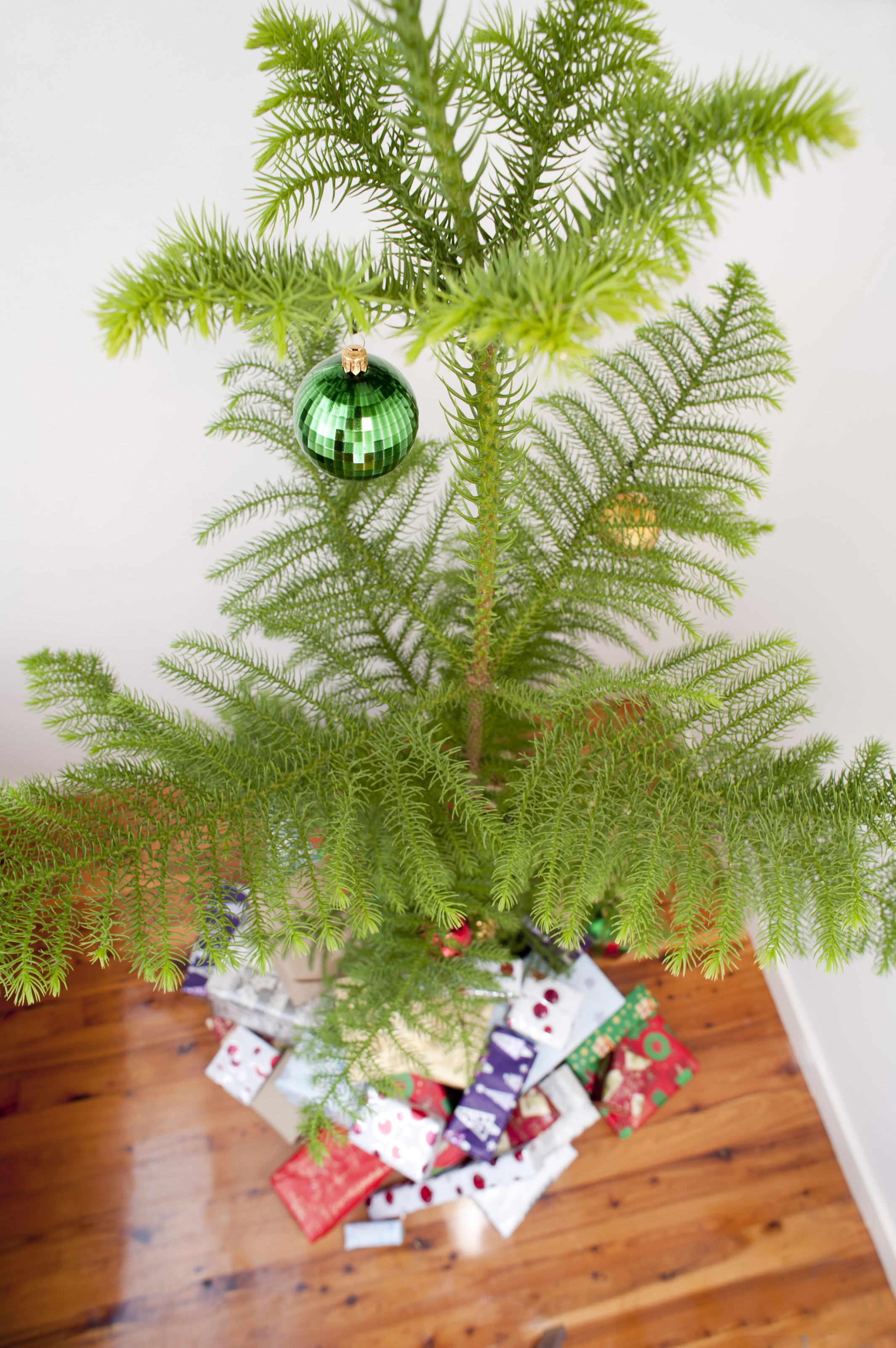Keywords: christmas, festive, seasonal, holidays, tree, real, natural, indoor, norfolk island pine, fir, branches, fronds, green, needles, wide angle, high angle, looking down, bauble, green, girts, presents, concept, modern, minimalist, minimalistic, minimal