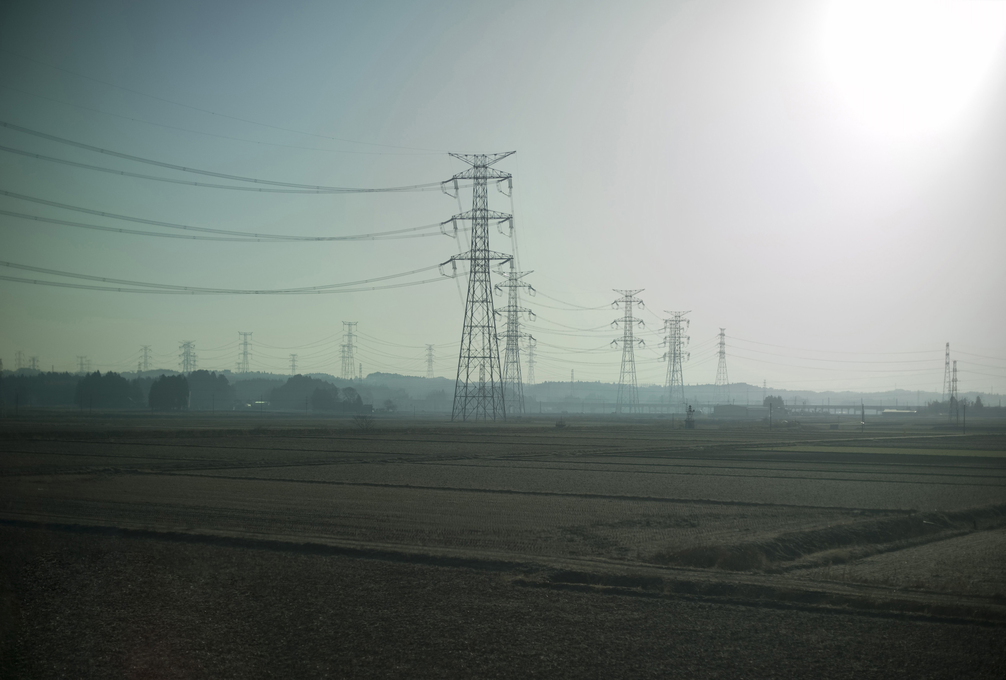 a landscape of metal power transmission towers or pylons