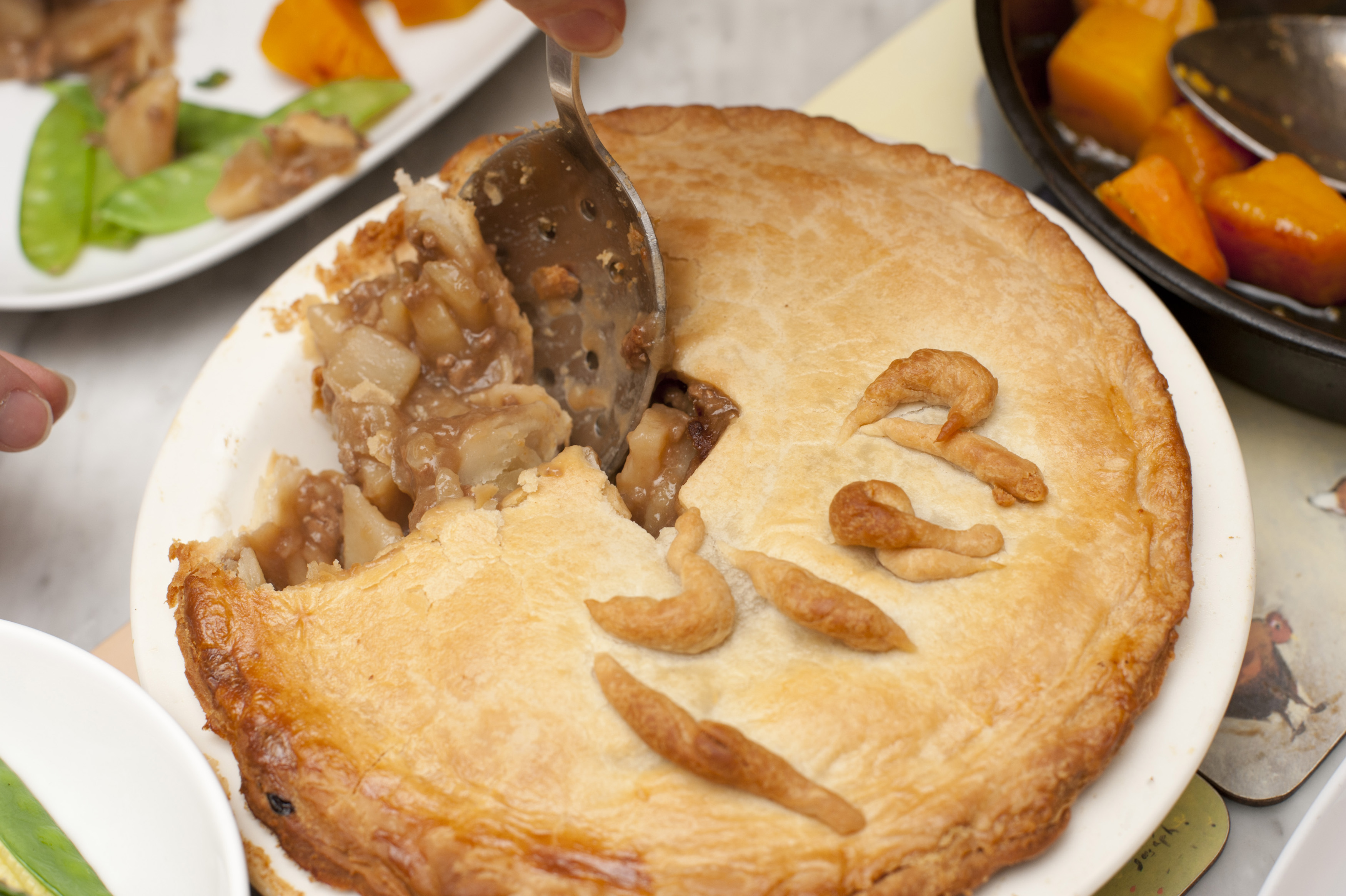 Delicious homemade meat pie with flaky crust being spooned into nearby plates with snap peas and butternut squash