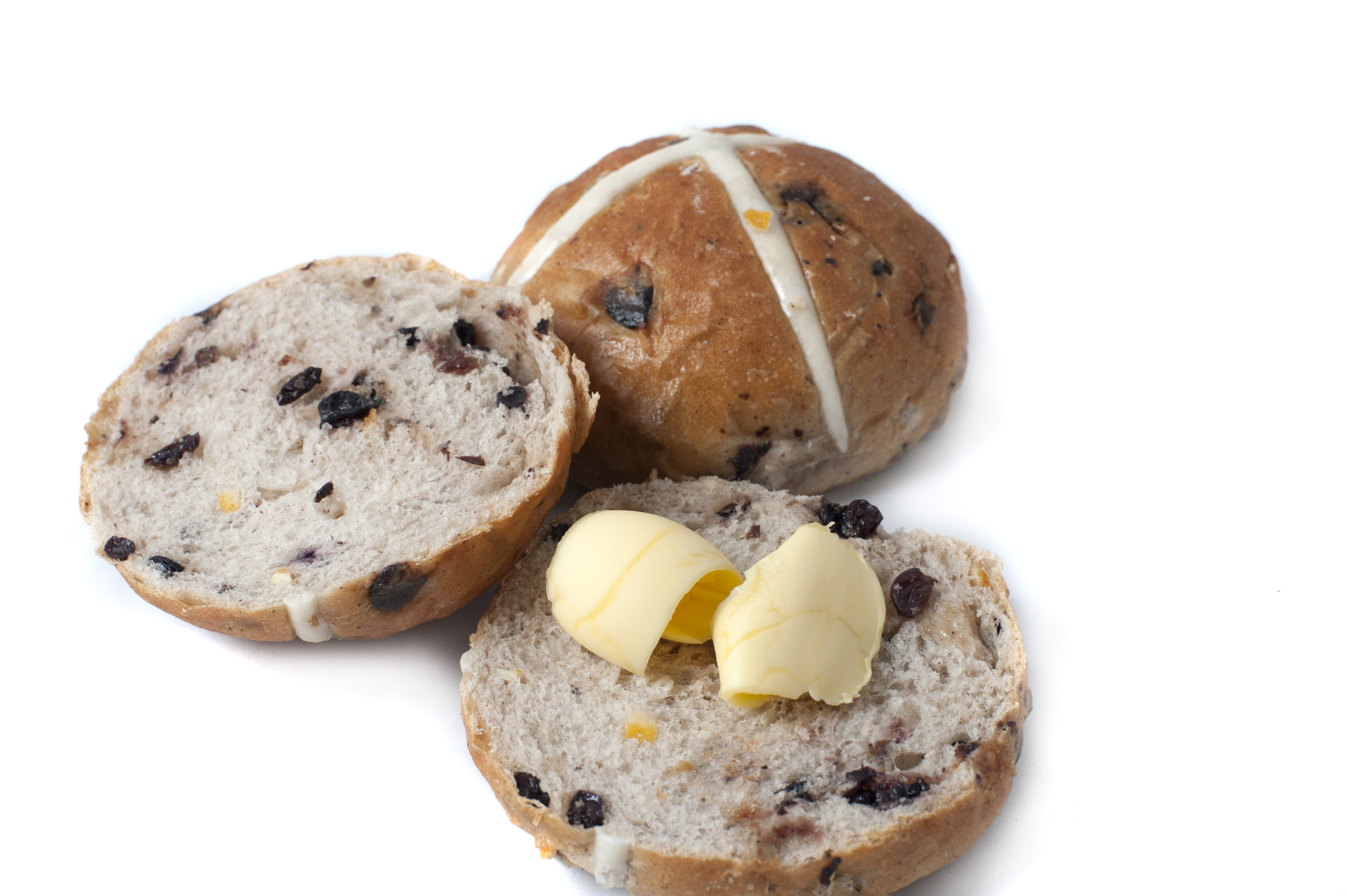 Keywords: background, bun, butter, cross, delicious, food, fresh, halved, hot, raisins, sliced, snack, studio, white, whole