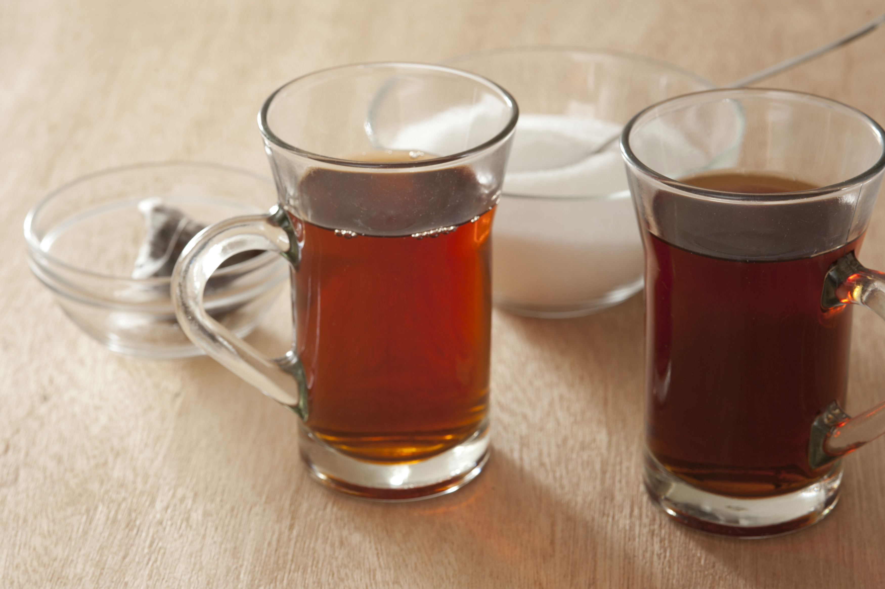 Two glass mugs of freshly brewed hot black tea with a bowl of sugar and the used teabags behind, high angle view