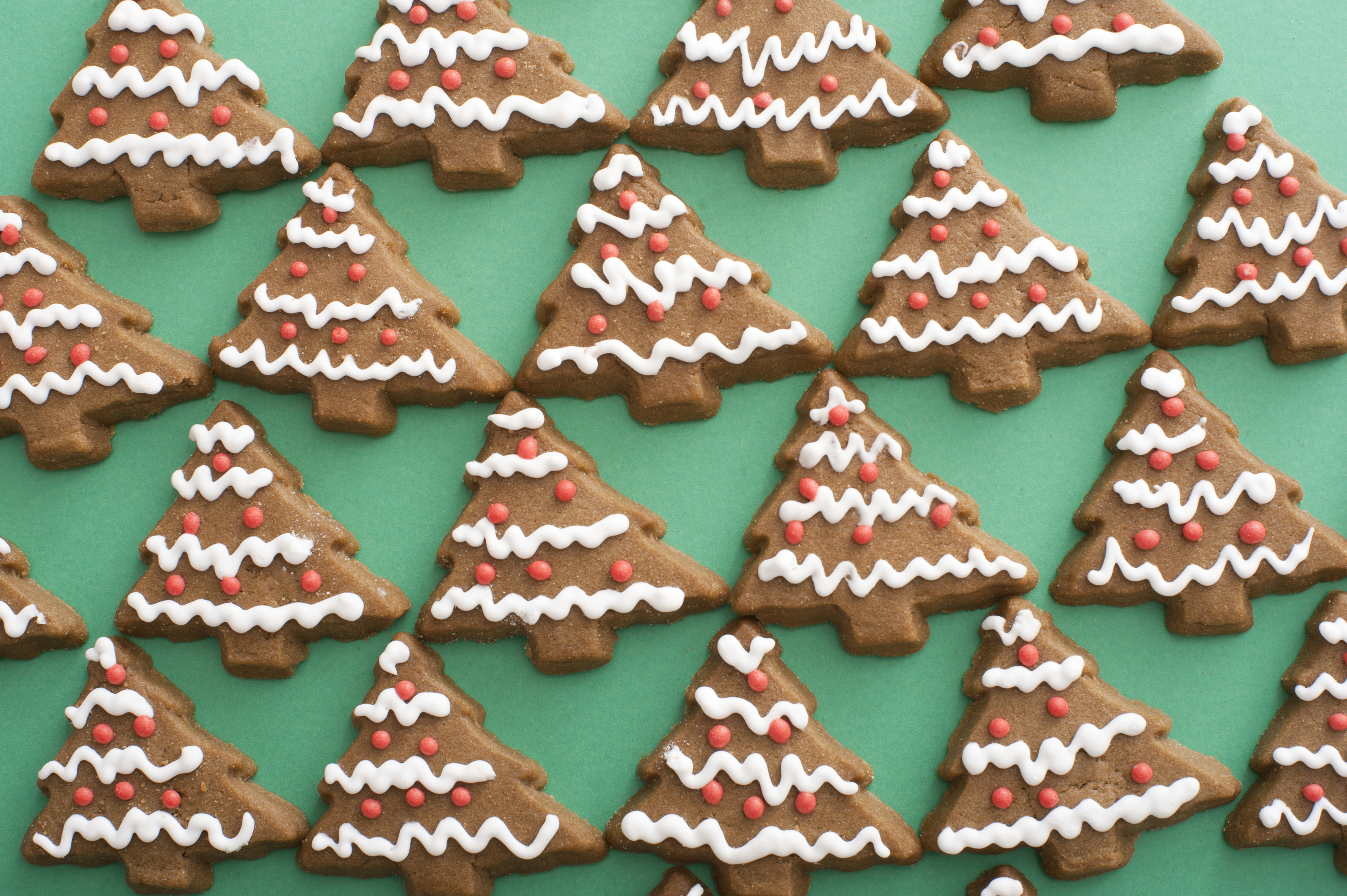 Keywords: background, baking, biscuits, christmas, food, gingerbread cookies, green, holiday, xmas, iced, tree, above, closeup, cookies, gingerbread