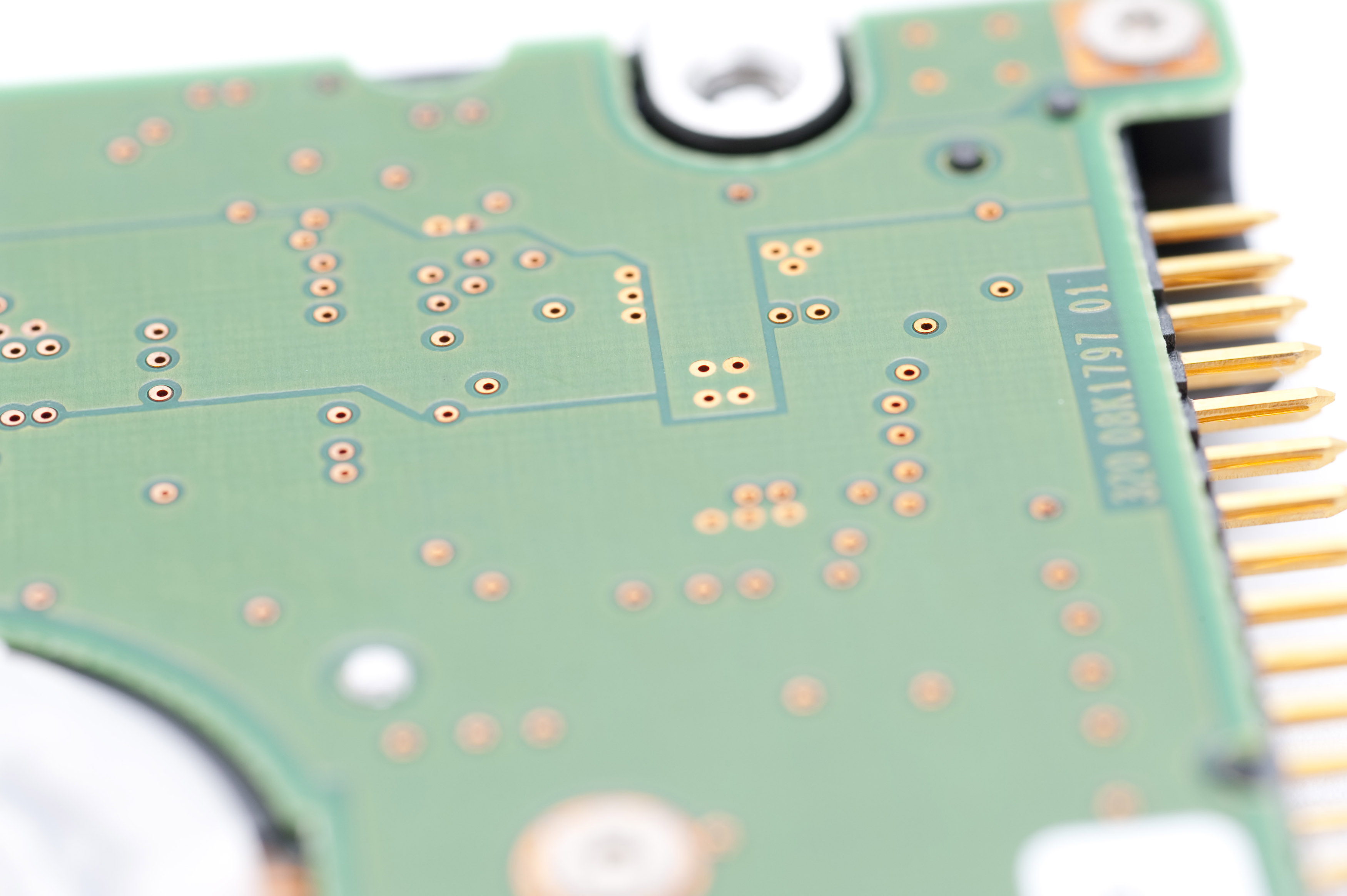 Hard disk drive close-up with IDE connector pins in focus