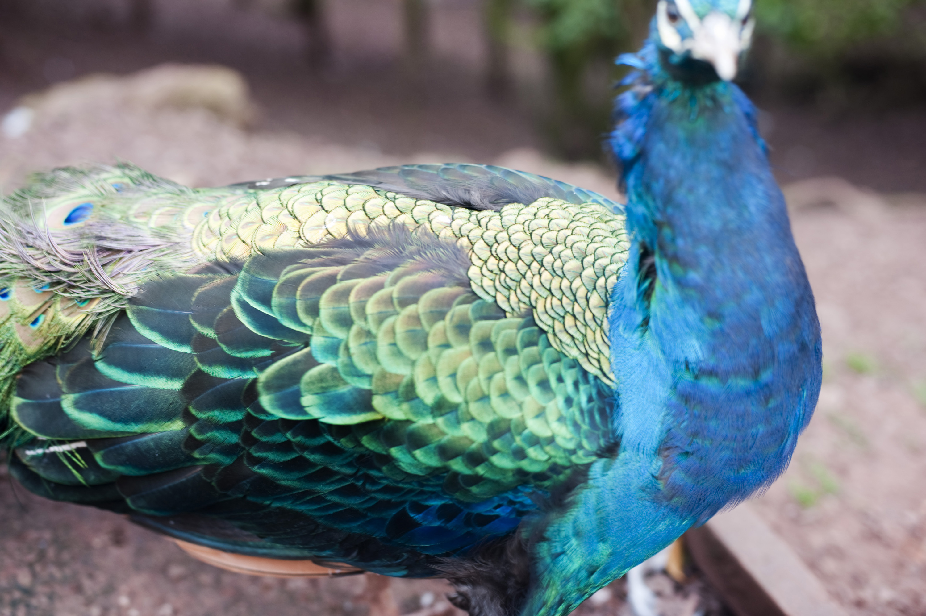 Keywords: wildlife, bird, domesticated, feathers, ornamental, plumage, peacock, peafowl, green, blue, iridescent, closeup, cropped, wing, captivity