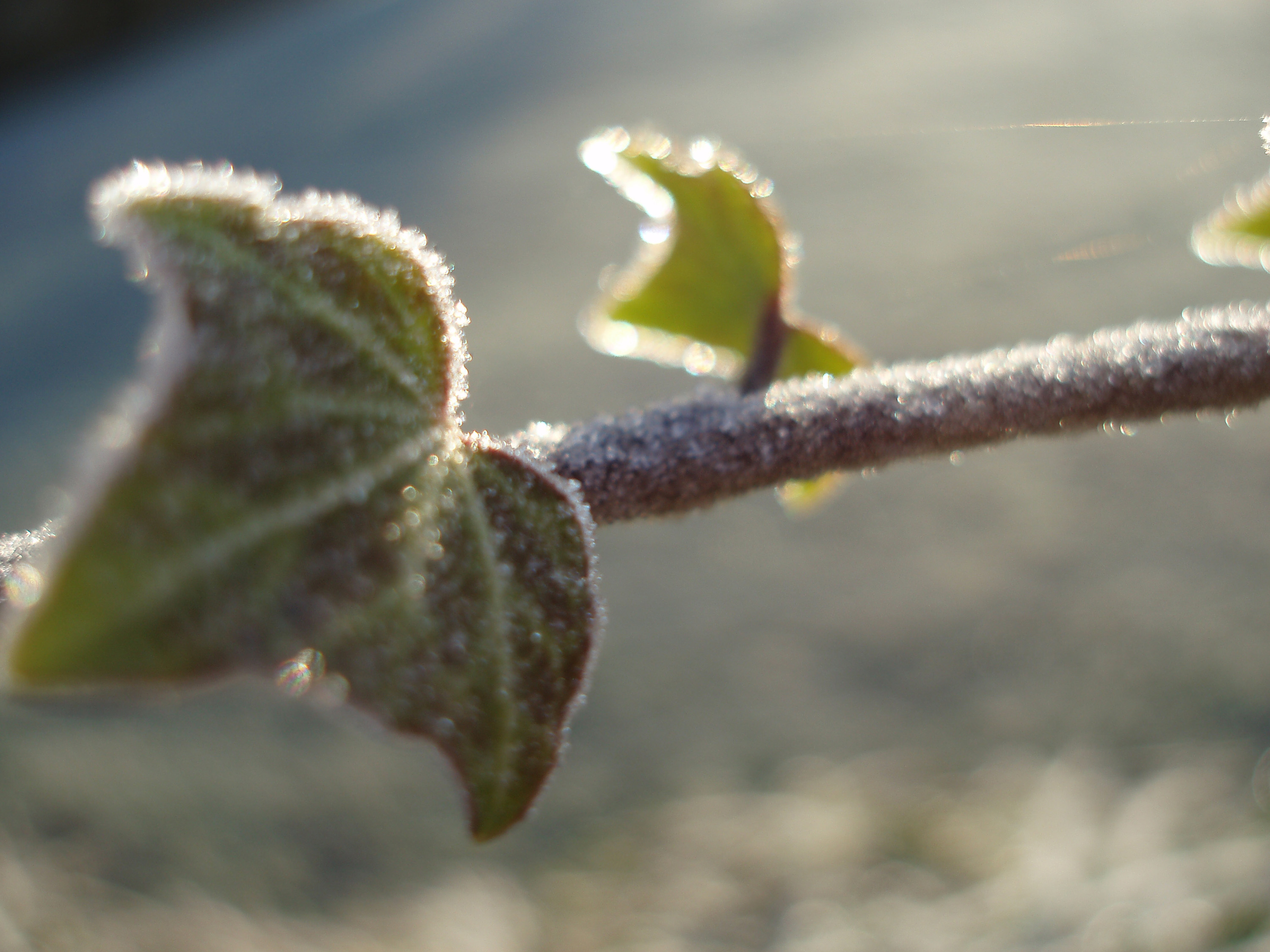 a narrow depth of field image of sun glinting off a frost covered ivy keaf