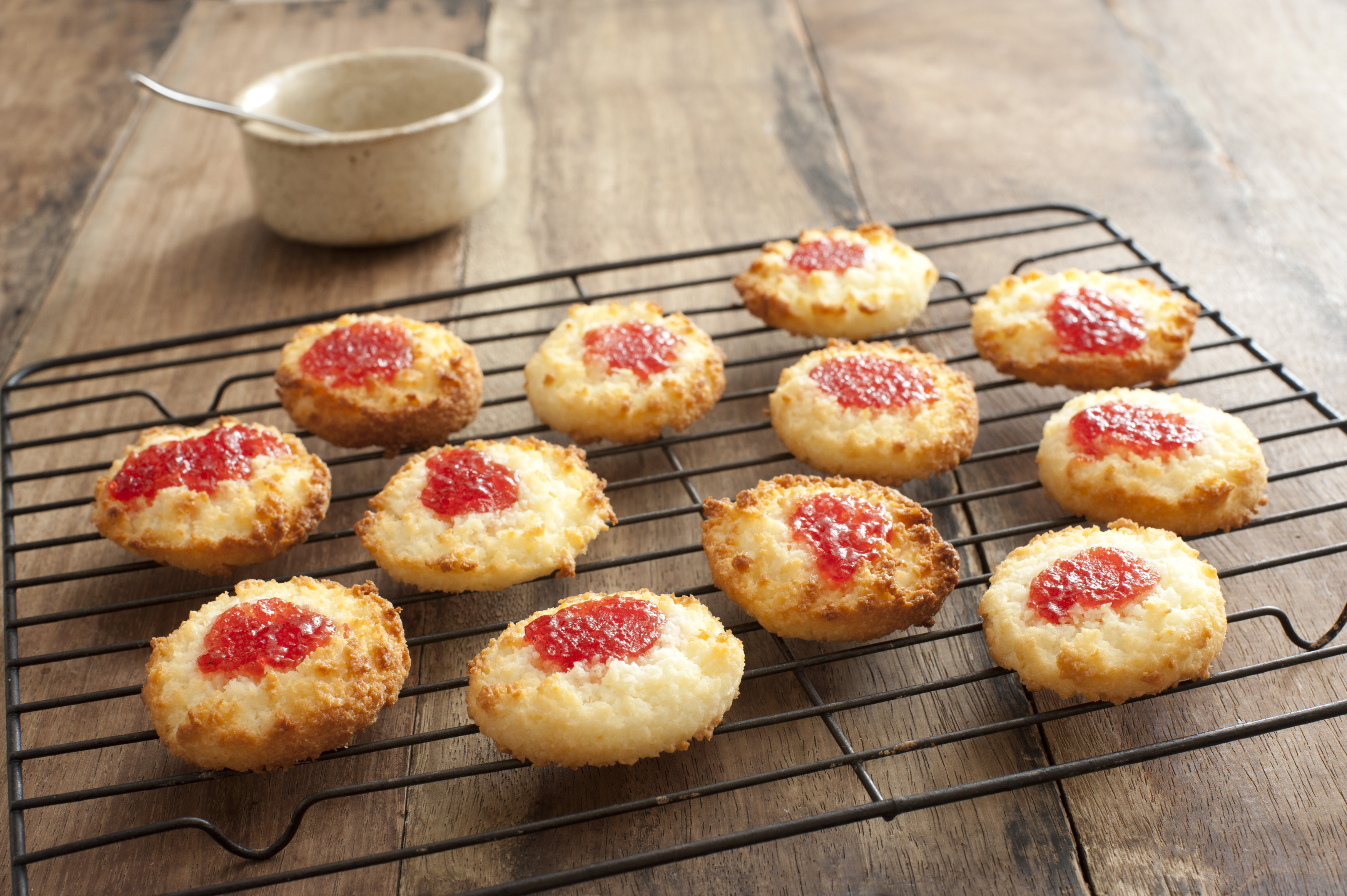Keywords: batch, coconut, cookies, cooling, drop, rack, wire, jam, strawberry, baking, homemade, recipe, baked, kitchen, food