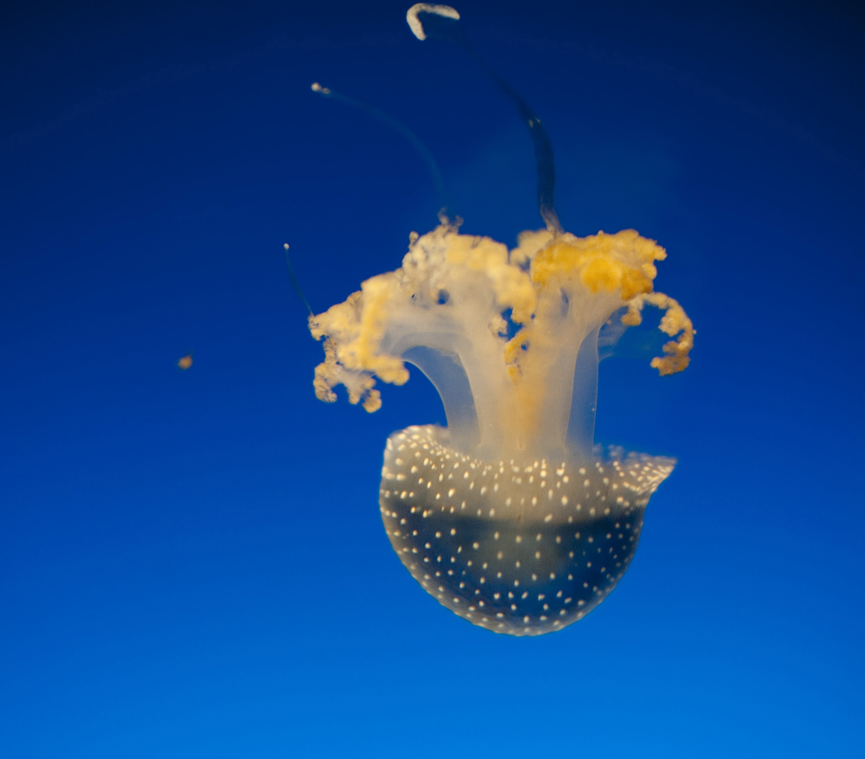 Keywords: underwater, aquatic, jellyfish, jelly fish, medusozoa, phyllorhiza punctata, marine, poisonous, stinging, tentacles, wildlife, marine biology, medusa, yellow, animal, aquarium, tourist attraction, arms, spotted, swimming