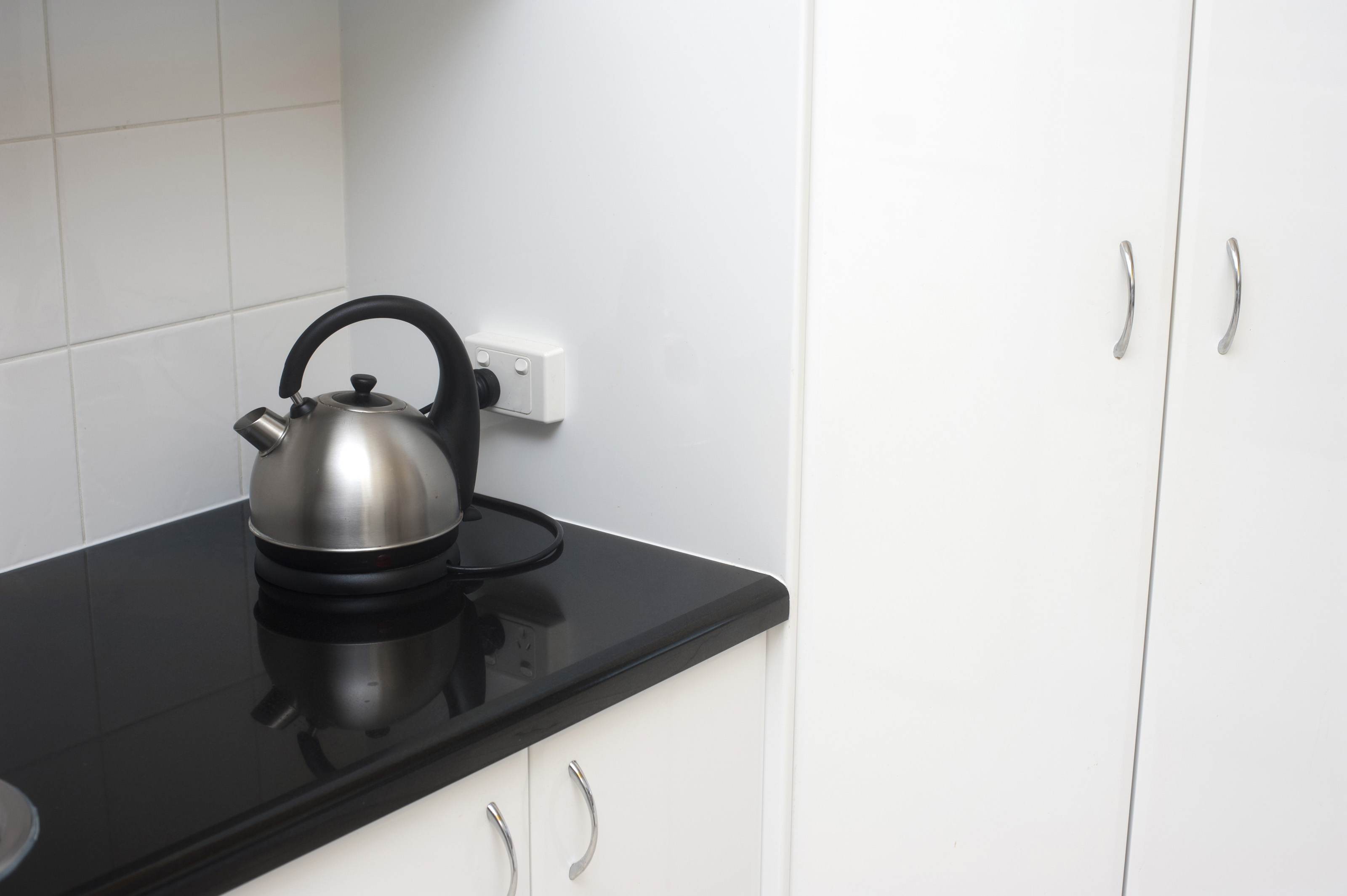 Modern electrical silver domed domestic kettle standing on a black countertop in a white tiled kitchen