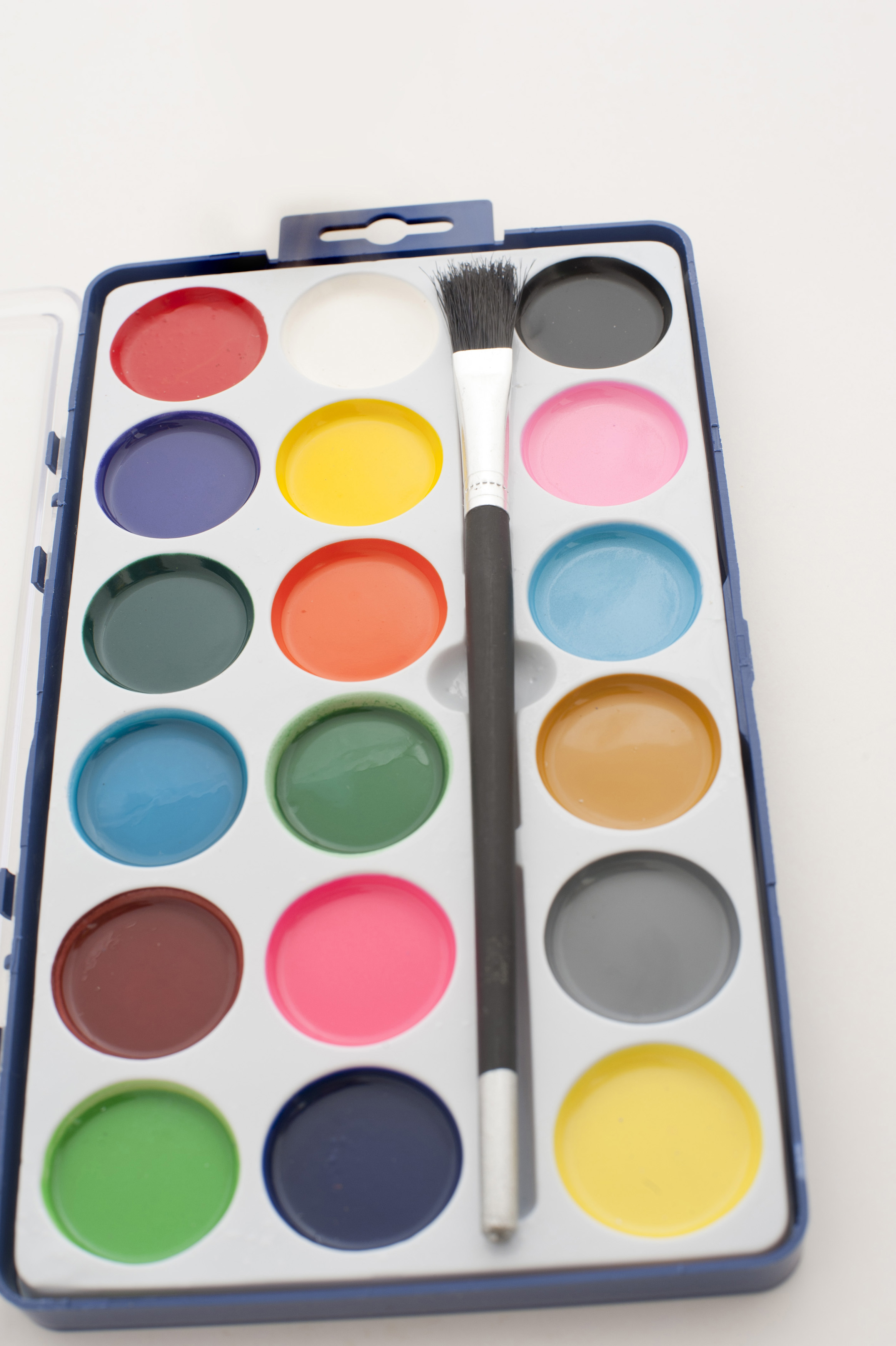 Artists palette of new water color paints in an open brand new box with a paintbrush viewed high angle lengthwise