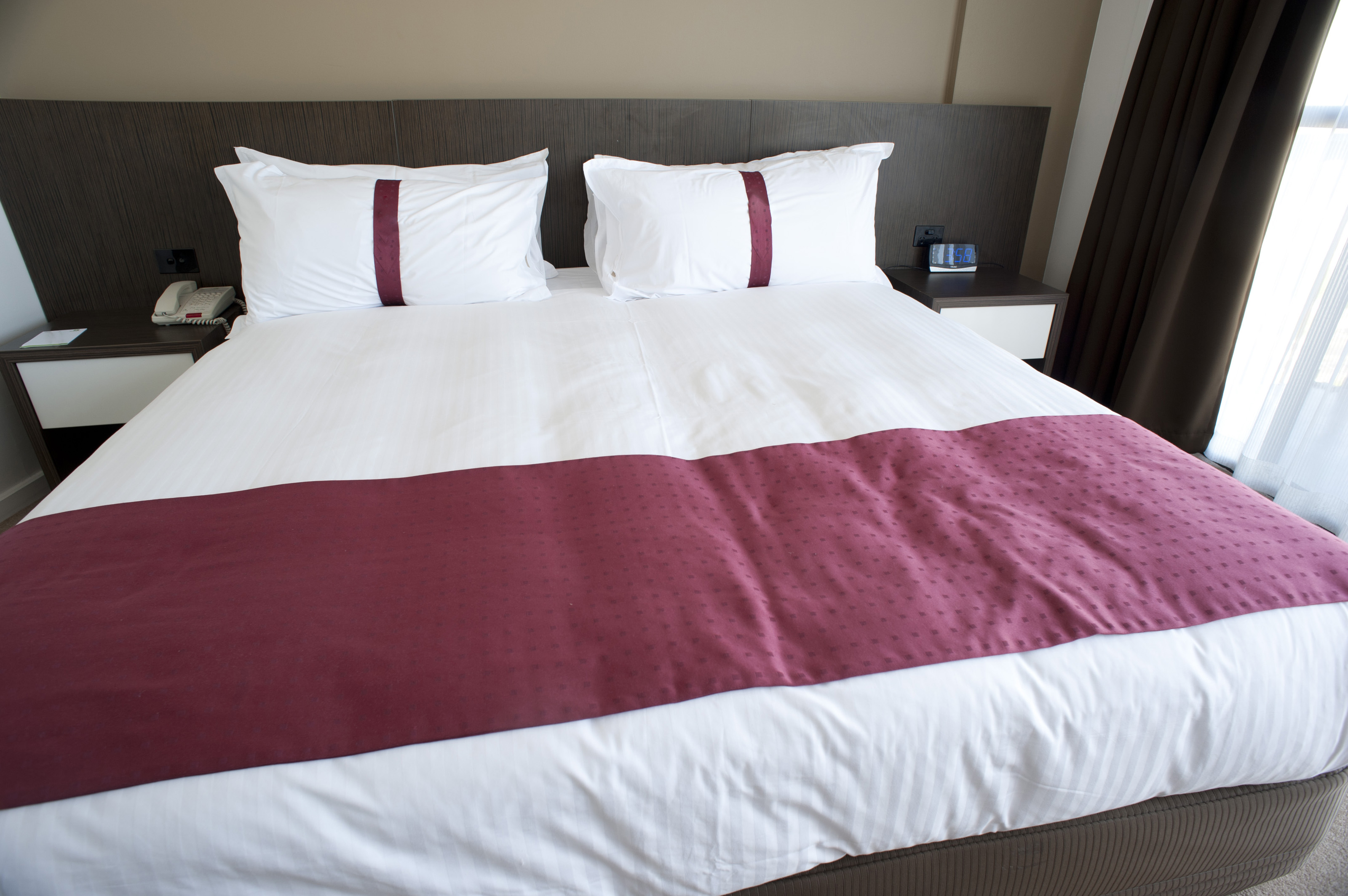 Keywords: bed, bedroom, modern, accents, accommodation, decor, duvet, foot, hotel, king size, purple, sleeping, wide angle, closeup, stylish, maroon