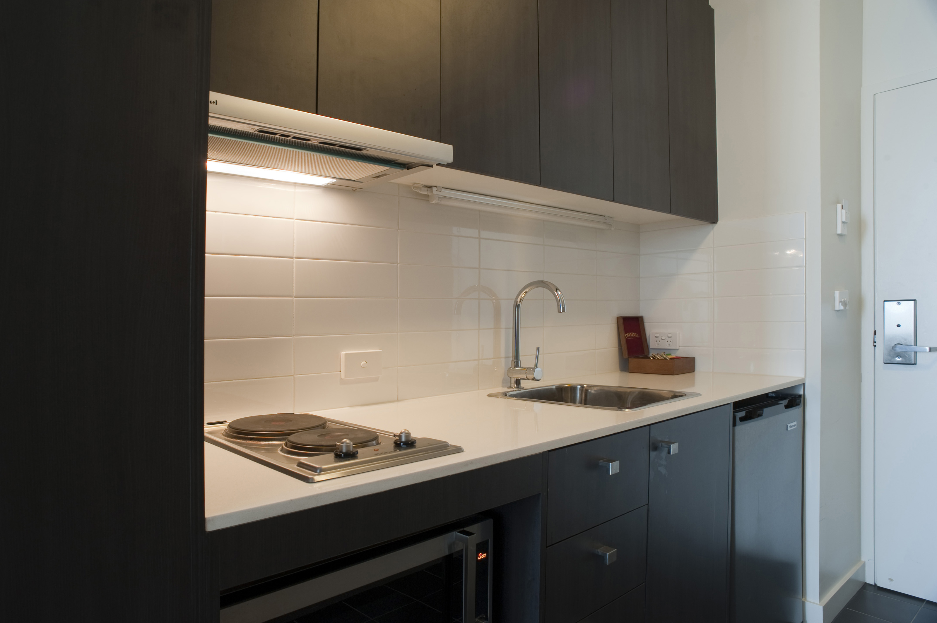 Interior of a modern compact kitchen with black cabinetry and a white tiled splashback above a white counter with hob and sink
