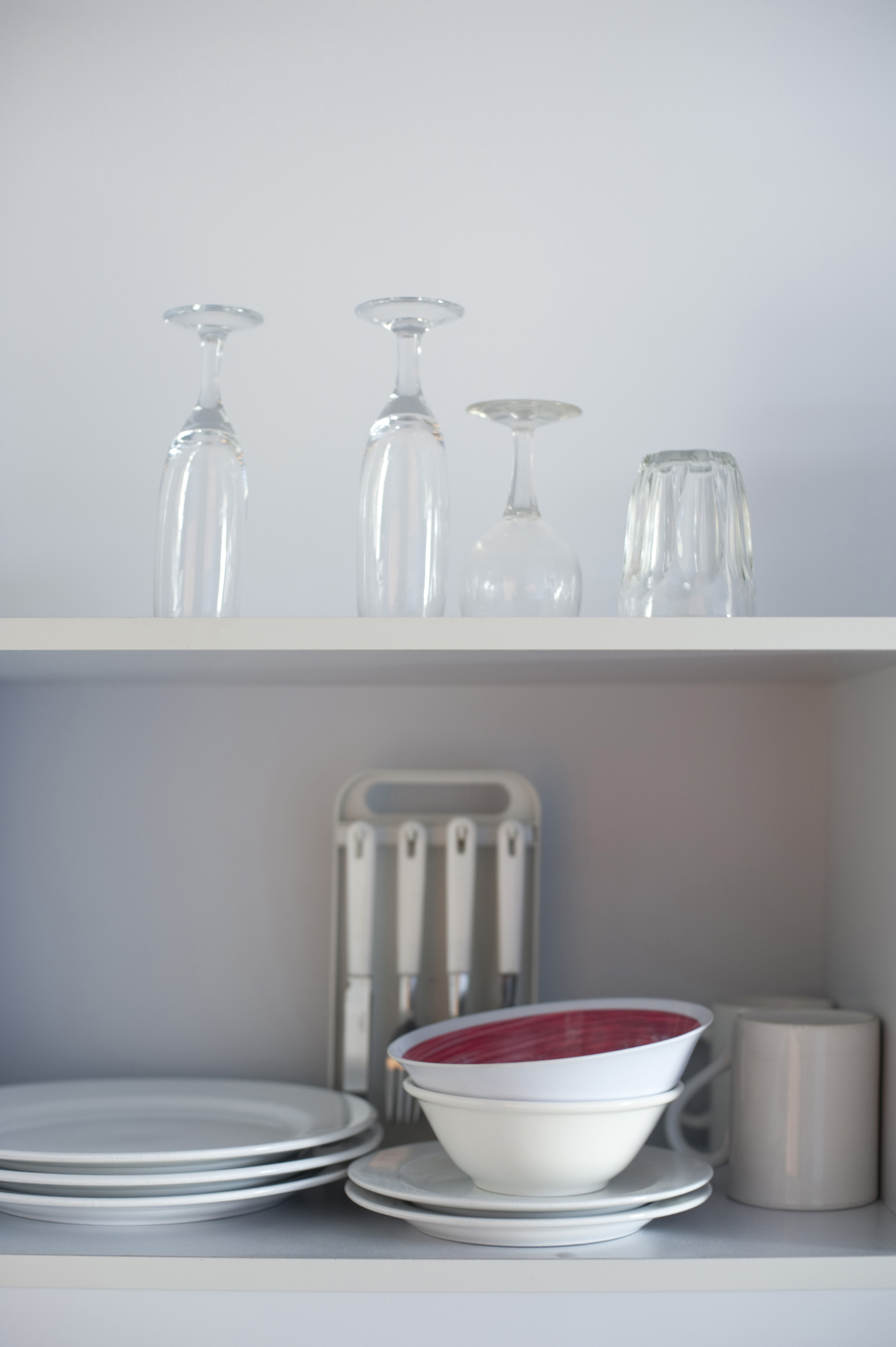 Keywords: kitchen, clean, neat, glasses, storage, shelf, crockery, glassware, plates, mugs, bowls, utensils, kitchenware, dishes, organisation, shelving, tableware, stacked, dinnerware, open