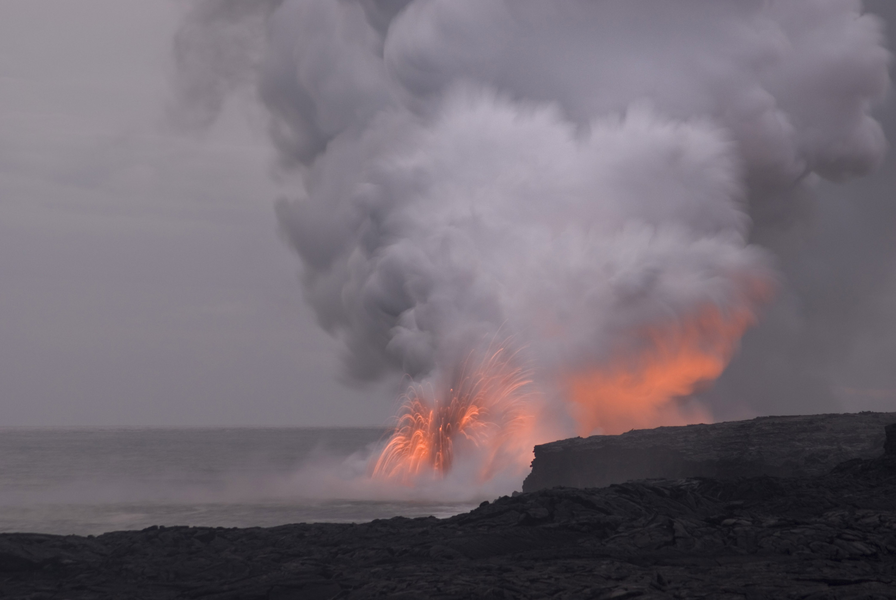 Keywords: hot, lava, red, orange, glow, smoke, steam, lava flow, sunset, dusk, sea, ocean, water, explosion, errupt, errupting, volcanic, volcanoes, volcano