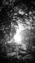 Black and white photo of gravestones.Photo Title: Black and white photo of gravestones.