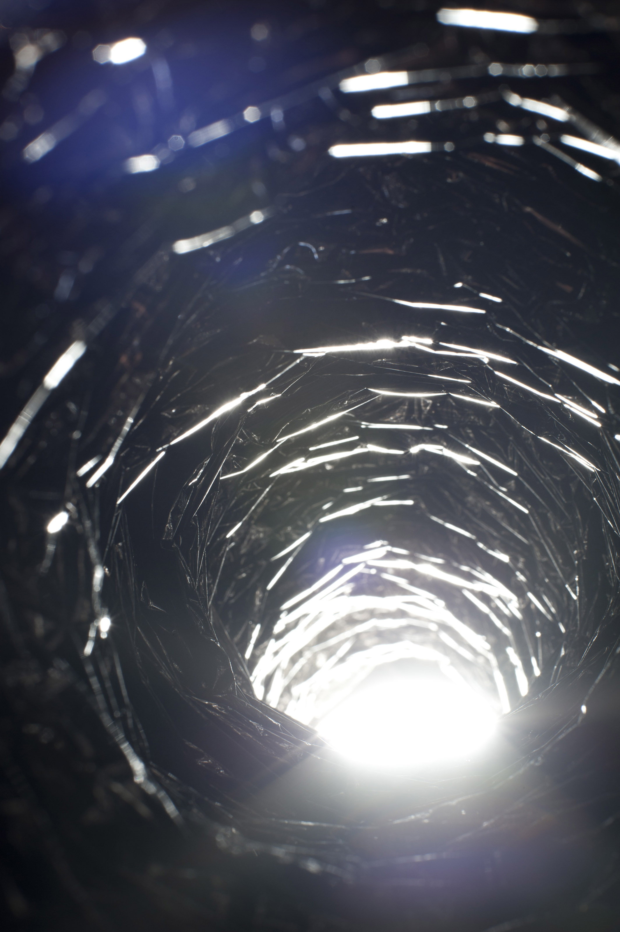 Ray of light passing through a tunnel with a view of the rough corrugated internal structure of the tube with bright light flare