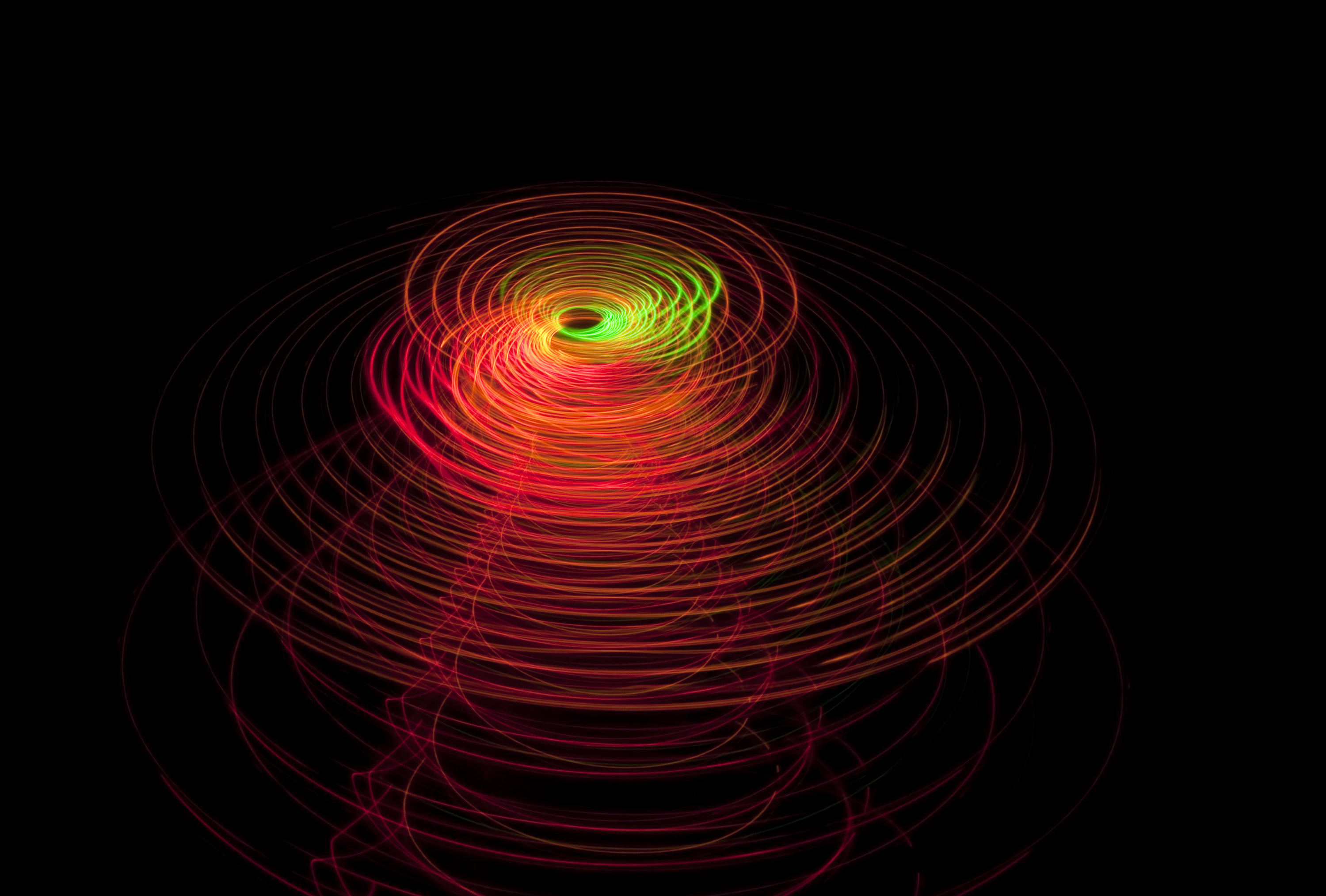 Keywords: light, pattern, circles, trails, trace, circle, colour, color, colorful, multi-colored, multicoloured, bright, saturated, glowing, abstract, unusual, eye catching, rotate. red