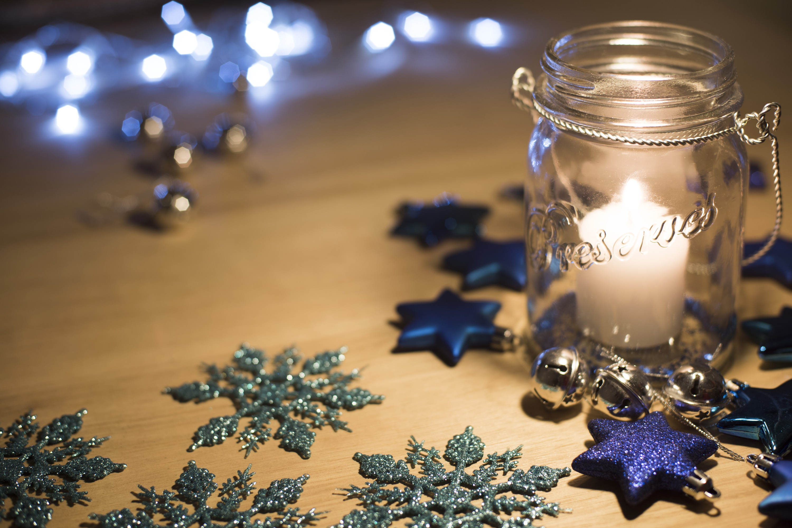 Burning candle in a glass jar surrounded by Christmas ornaments on a wooden table with copy space and background bokeh of sparkling party lights