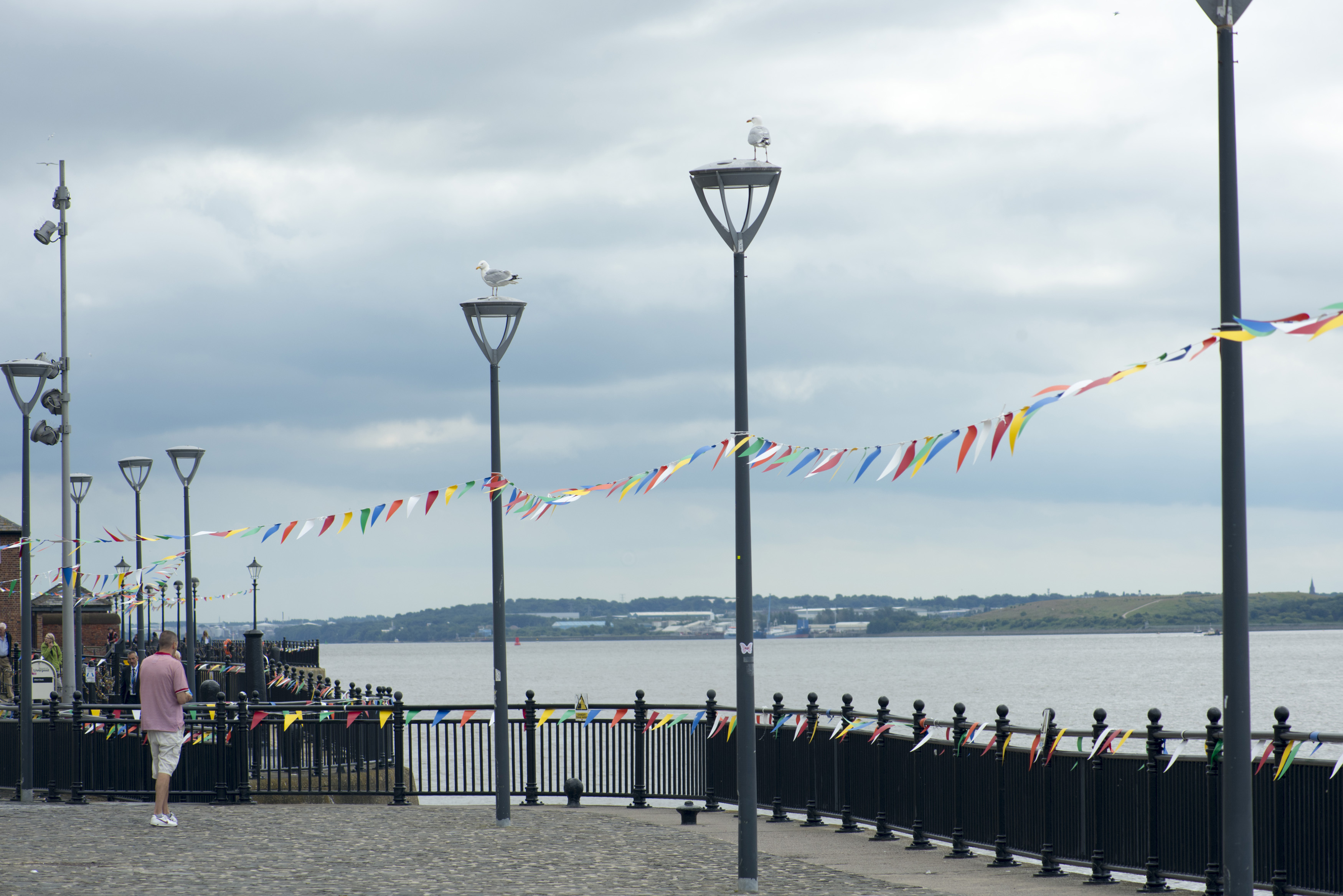 Keywords: liverpool, uk, between, bunting, cloudy, festive, flags, lamps, mersey, promenade, railing, string, united kingdom, waterfront, person