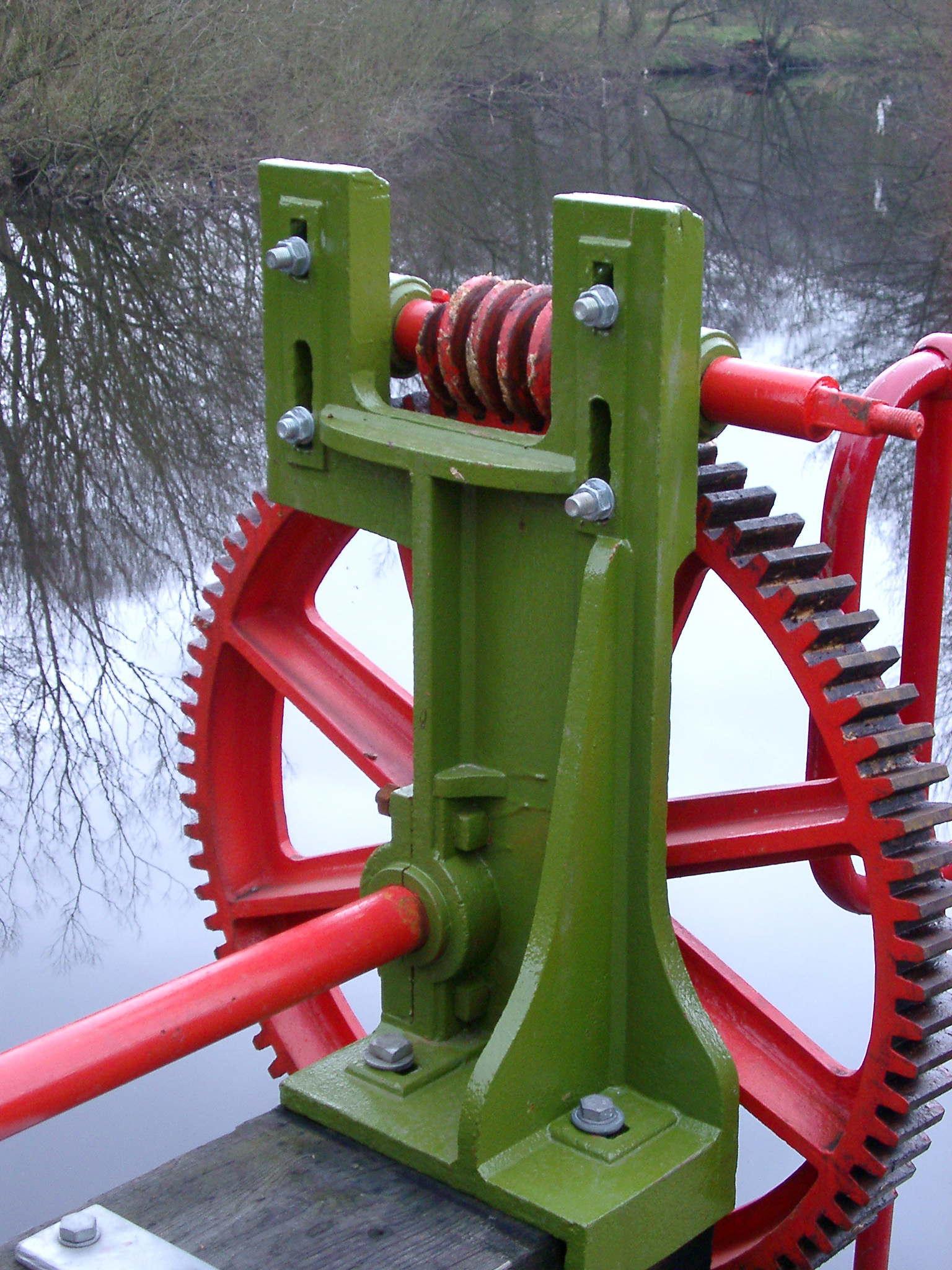 Keywords: industry, red, green, bright, handle, cog, wheel, control, waterway, lock, weir, gate, open, close, crank