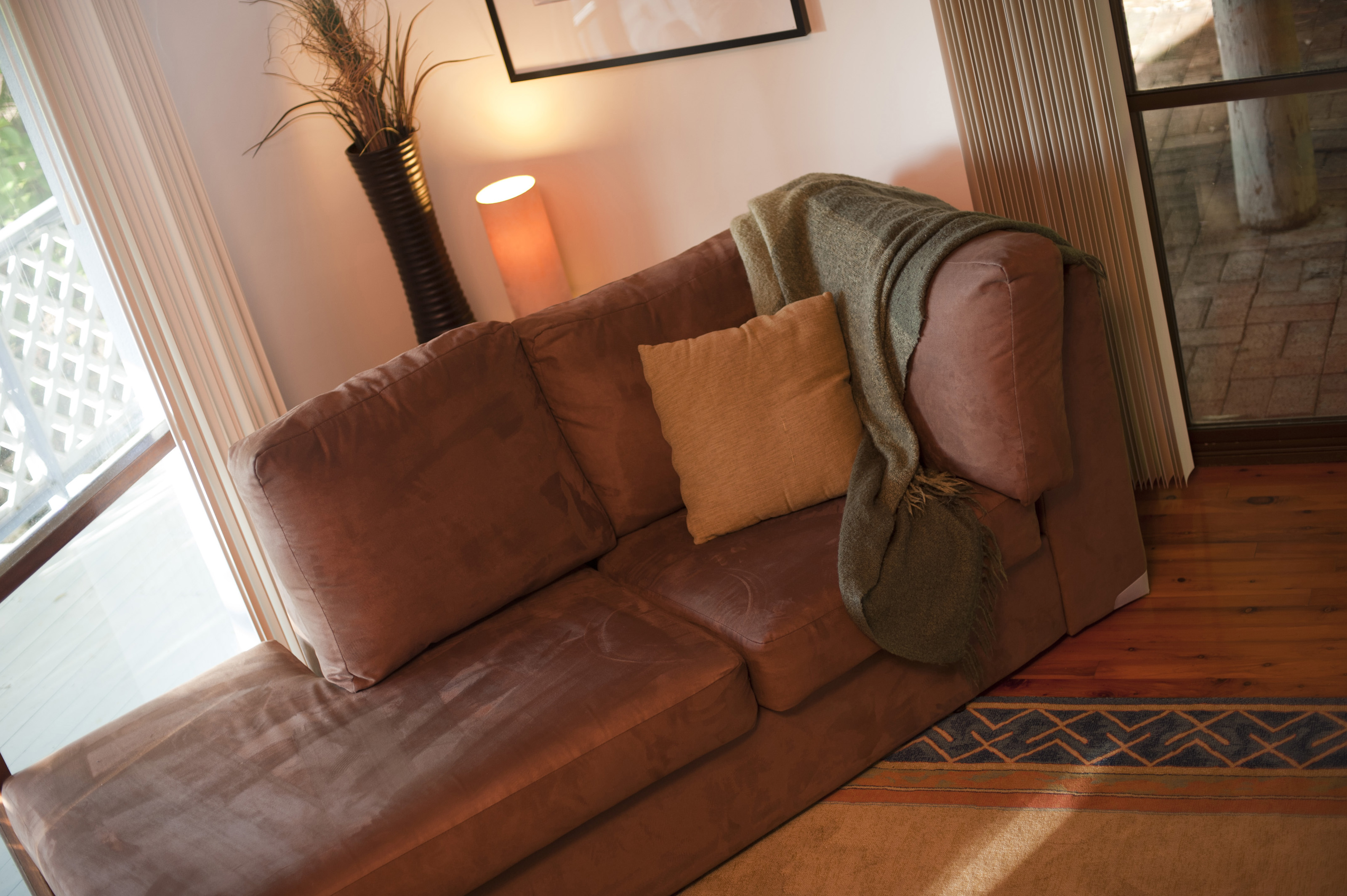 Angled settee in a lounge with a cushion and throw rug in front of a window leading on to a balcony