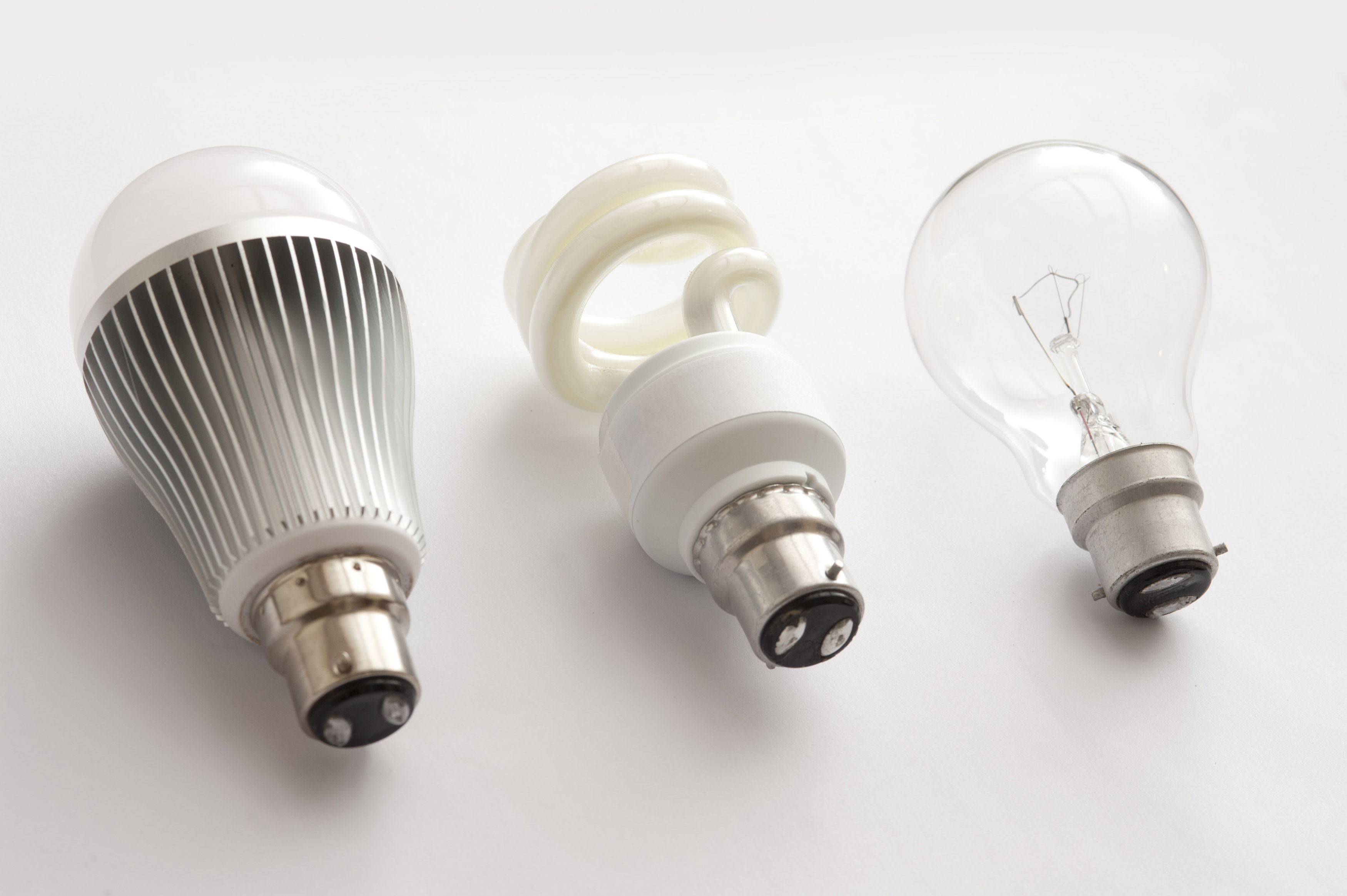 Three generations of light bulbs - LED, fluorescent and incandescent, in one row close-up on white background
