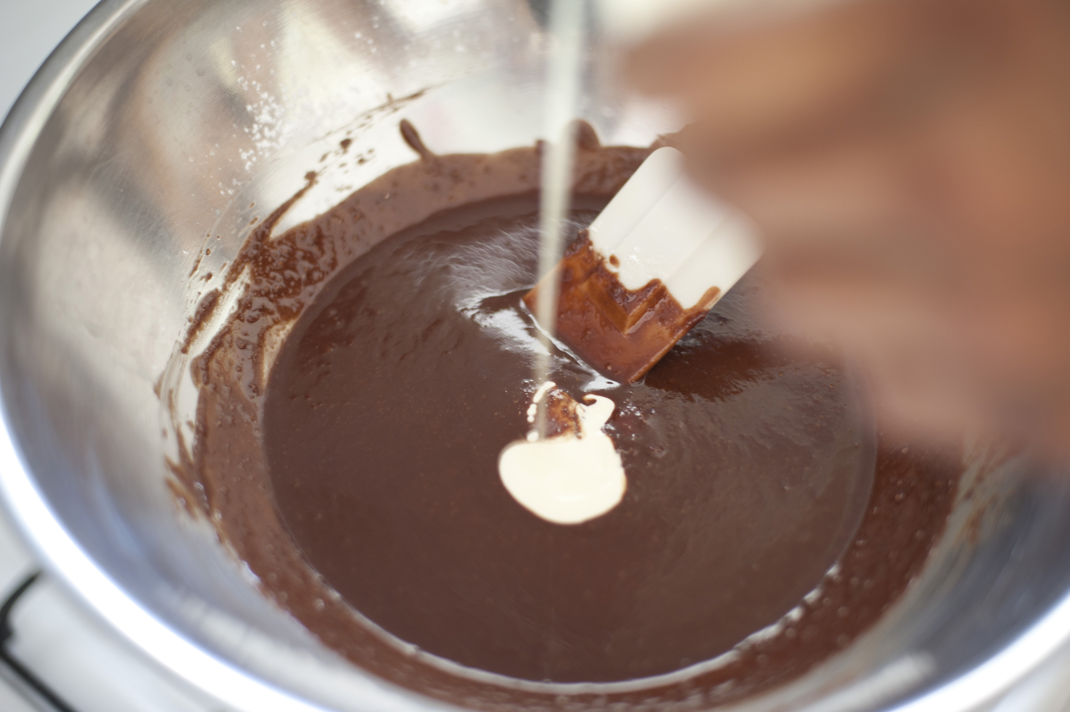 Keywords: candy, chocolate, flavor, icing, melted, pouring, sugar, sweet, bowl, mixing, spatula, baking, ingredients, stainless steel, food