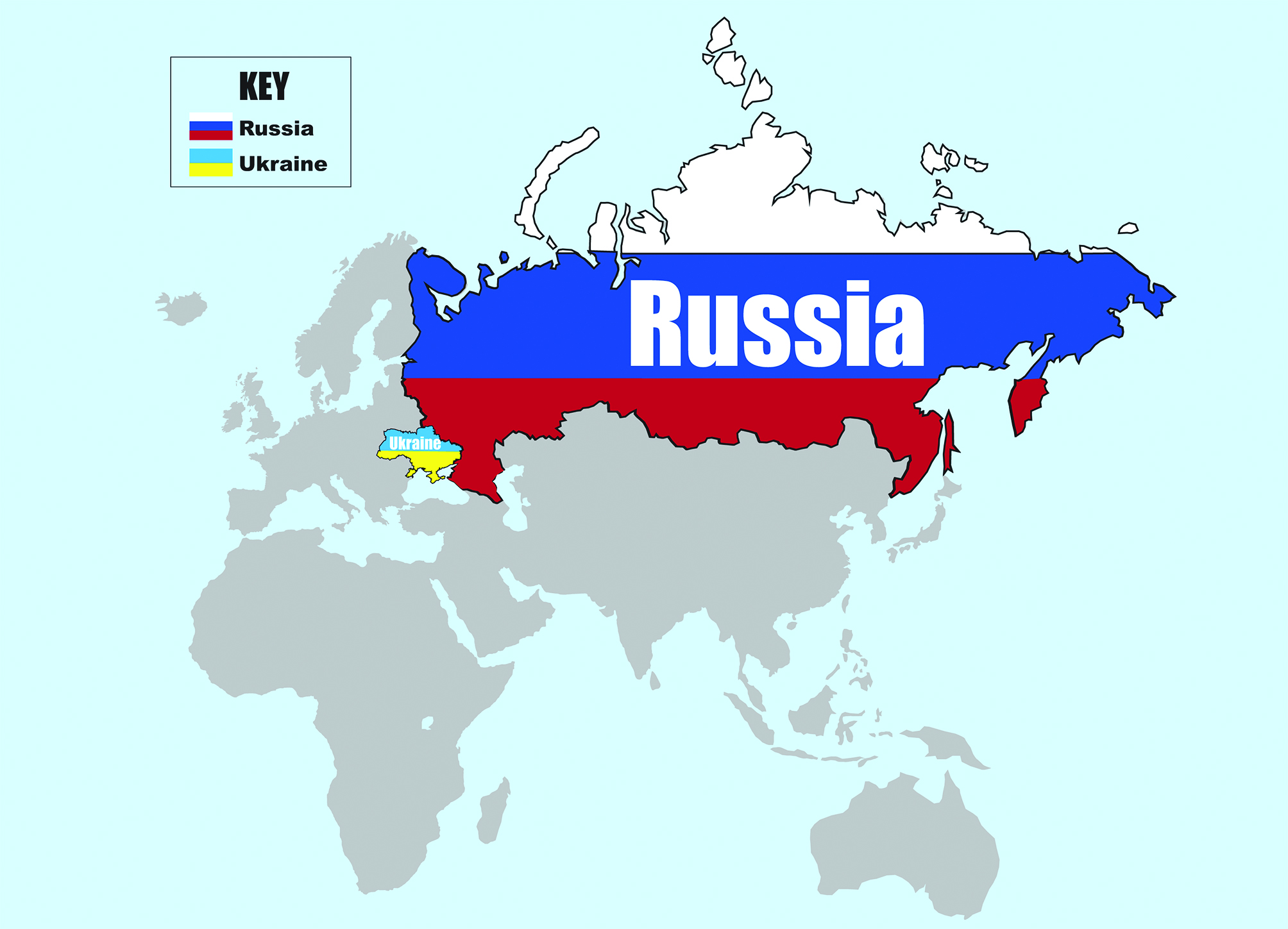 Map showing the size of Russia compared to Ukraine and the rest of the world. This is a very simple map but it is to scale.
