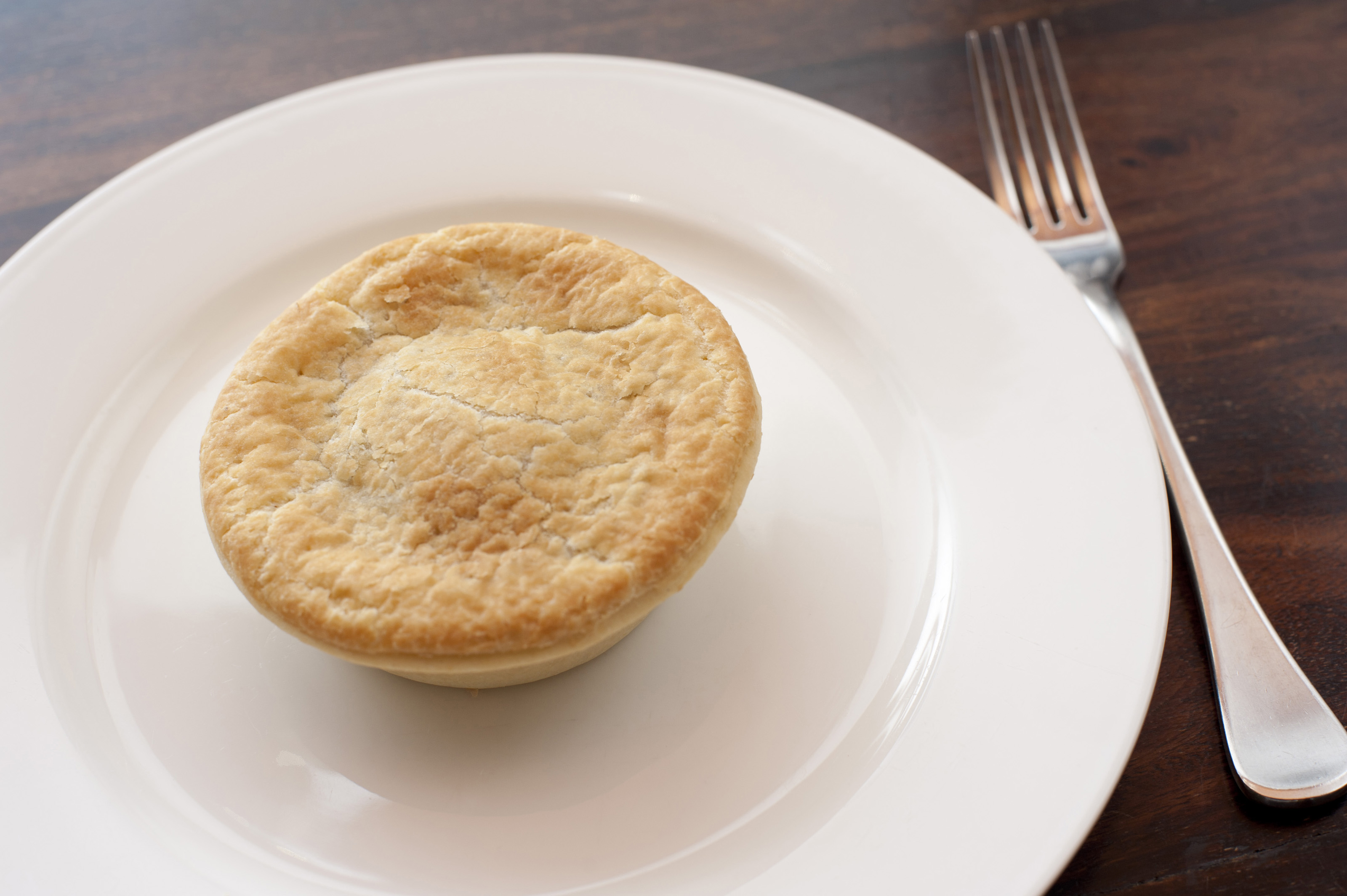 Freshly baked meat pie with a golden pastry crust served on a plain white plate for a snack or lunch