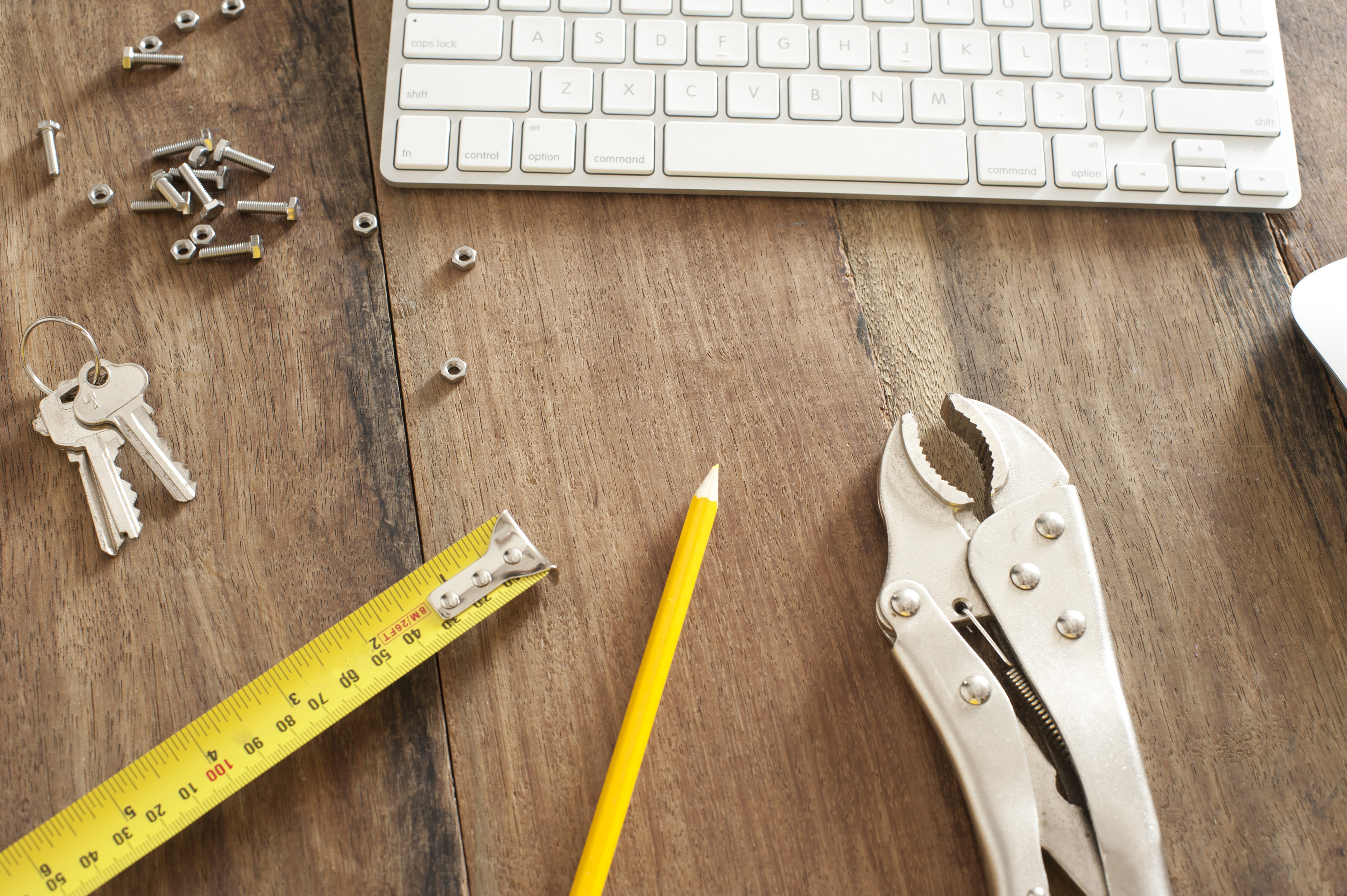 Keywords: bolts, computer, concept, displayed, engineering, keyboard, keys, measure, mechanical, mole grip, nuts, table, tape, wooden, pencil
