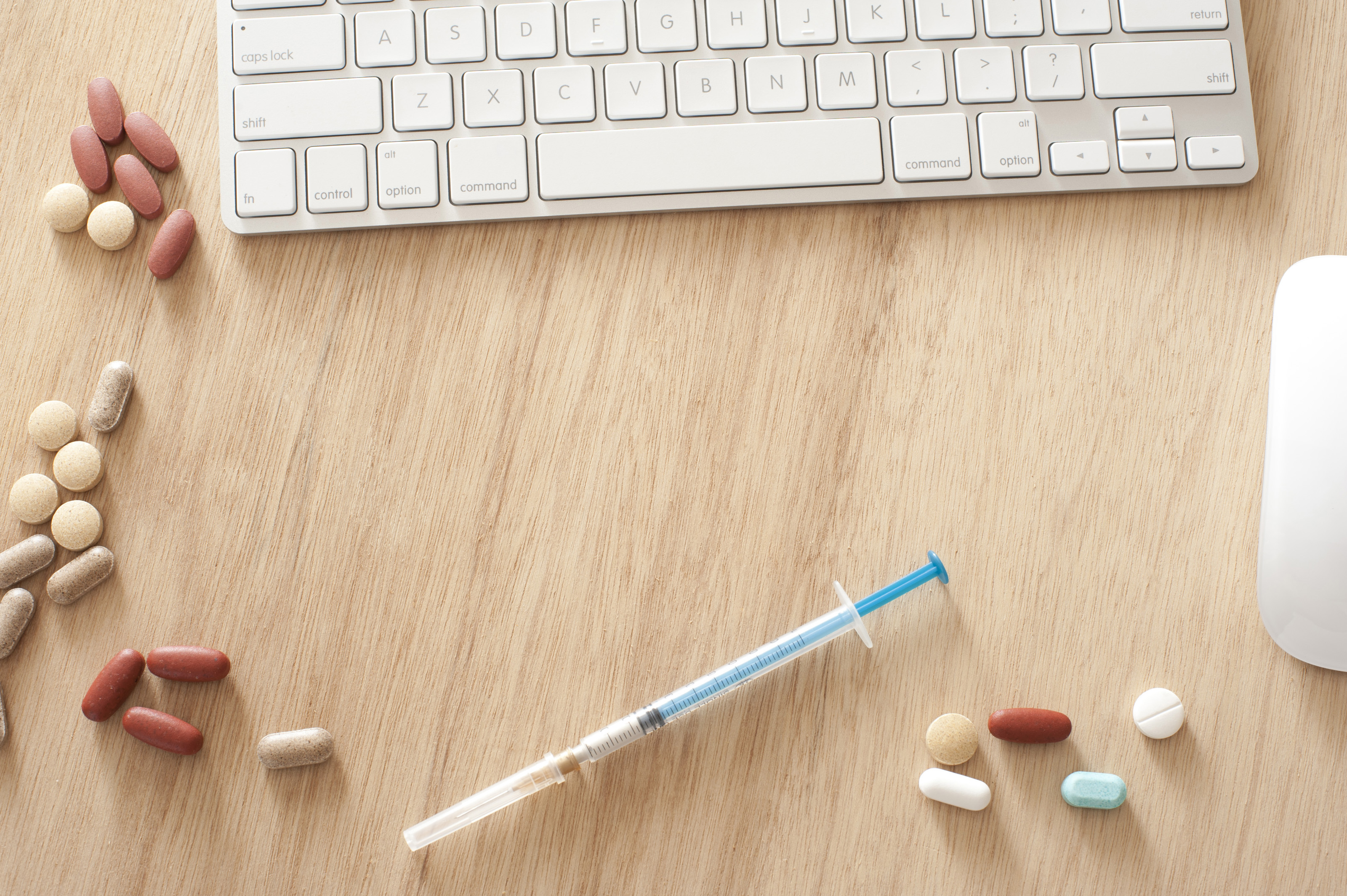 Keywords: medical, above, hero, copy space, desk, computer, keyboard, medication, needle, pills, syringe, technology, wooden, injection, digital, dose
