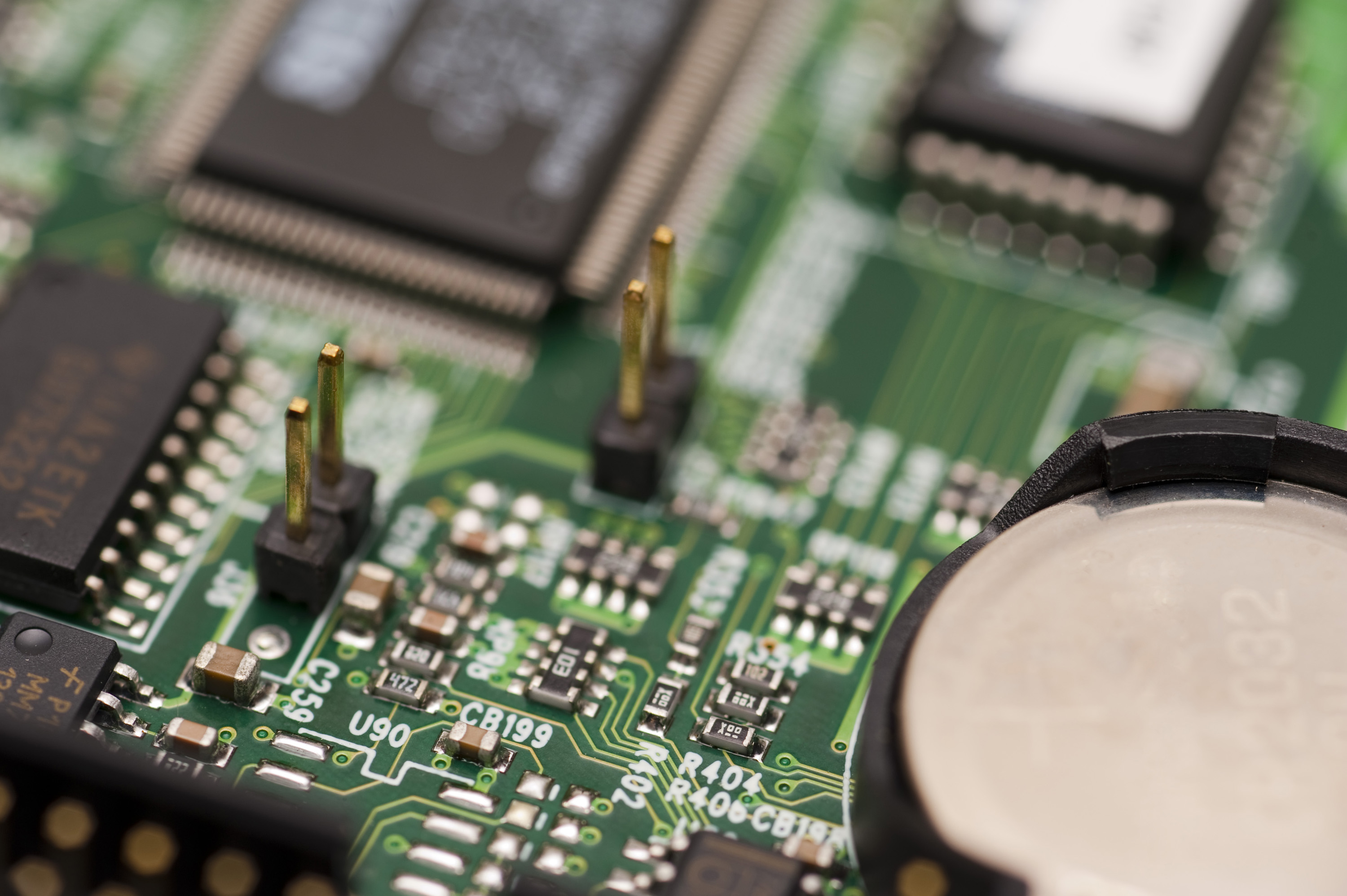 a narrow depth of field image details an electronic circuit board, pictured with a narrrow depth of field