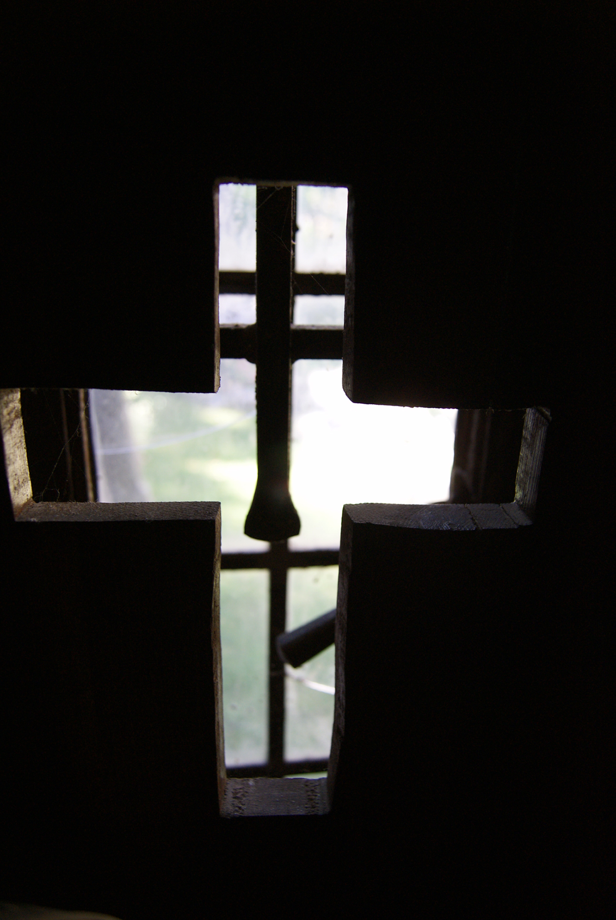 A cross is carved out of thick, heavy ancient doorPhoto Title: Cross