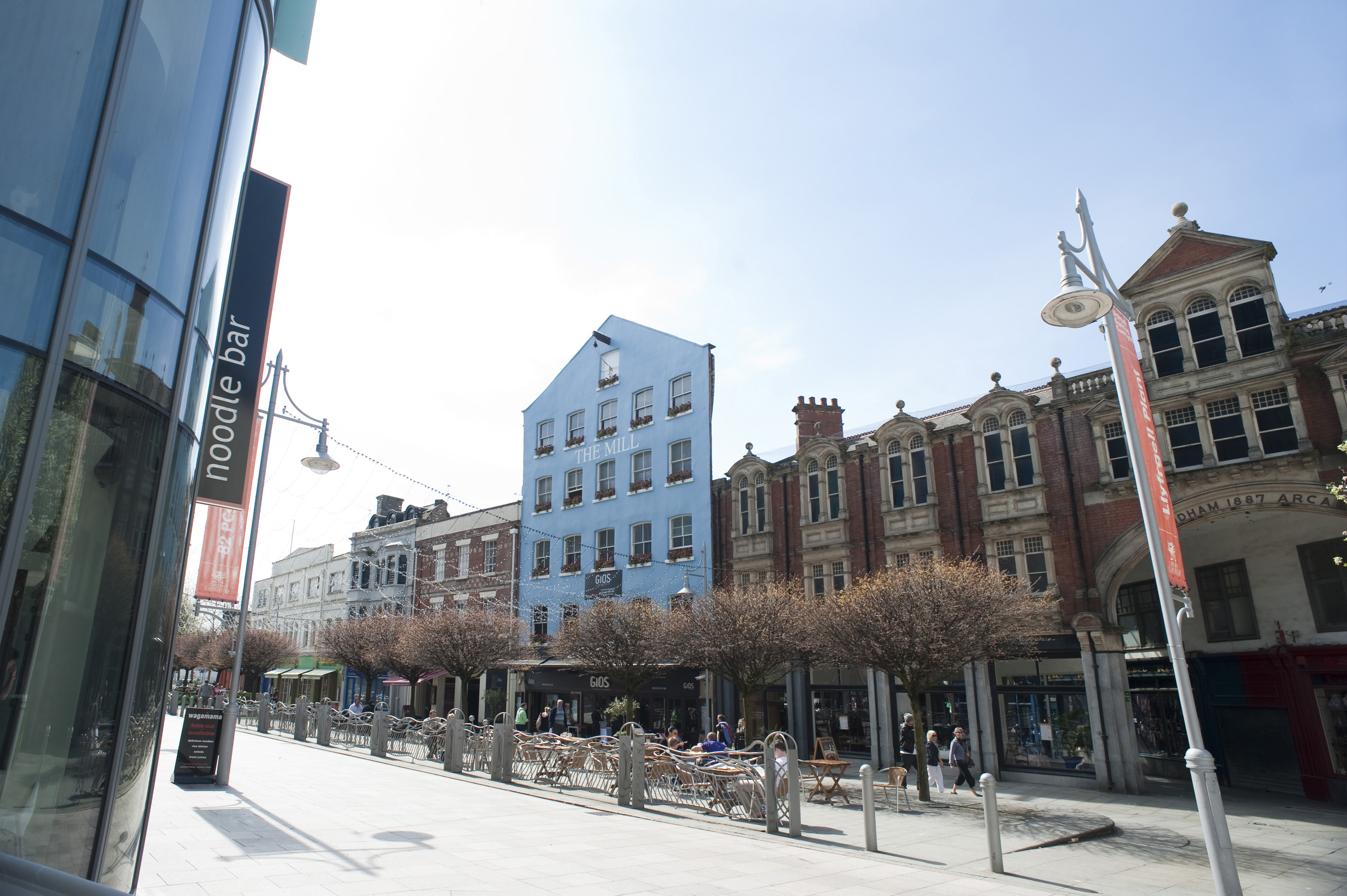 Keywords: street, uk, trees, day, outside, city, architecture, road, exterior, facade, pedestrian, capital, great britain, centre, precinct, shops, thoroughfare, wales, cardiff, welsh