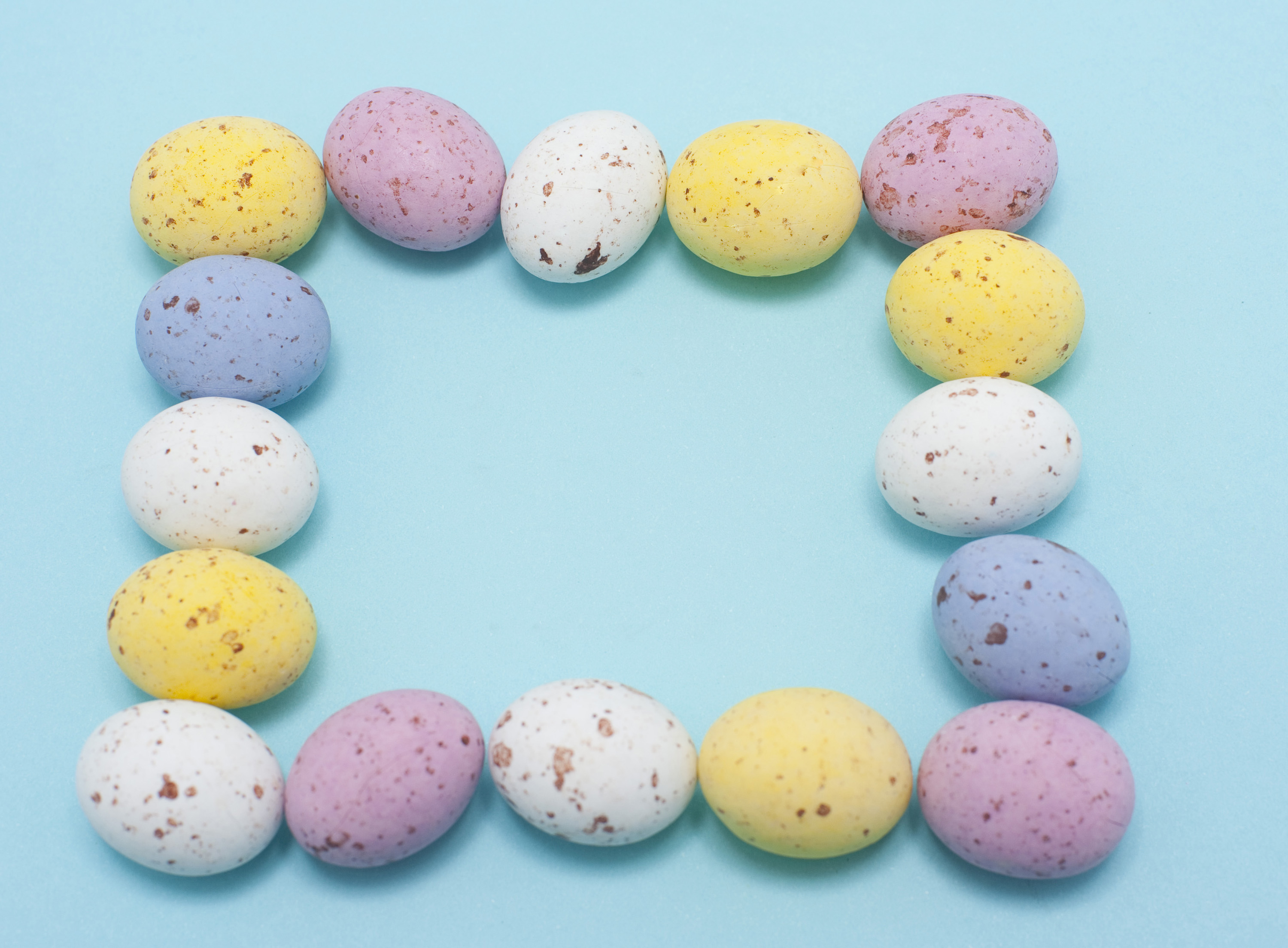 Mini Egg Easter Frame of speckled candy Easter eggs arranged in a square on a turquoise blue background