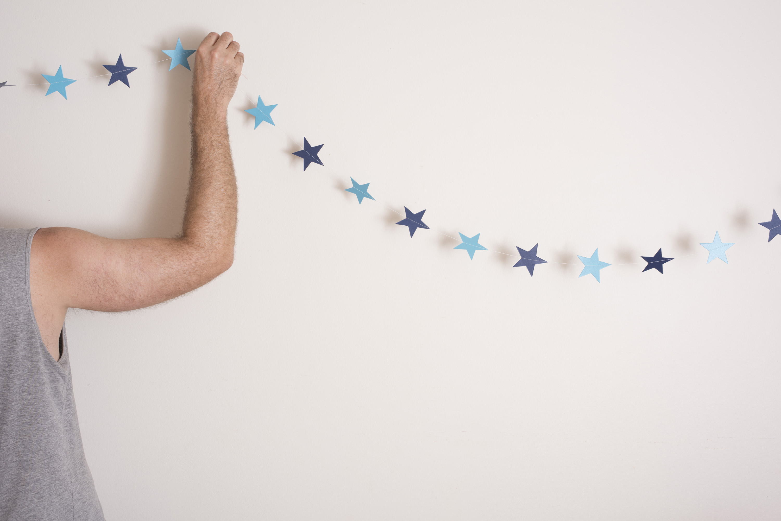 Keywords: blue, bunting, christmas, decorations, home, man, stars, string, wall, xmas, hanging, holiday, minimalist, garland, copy space