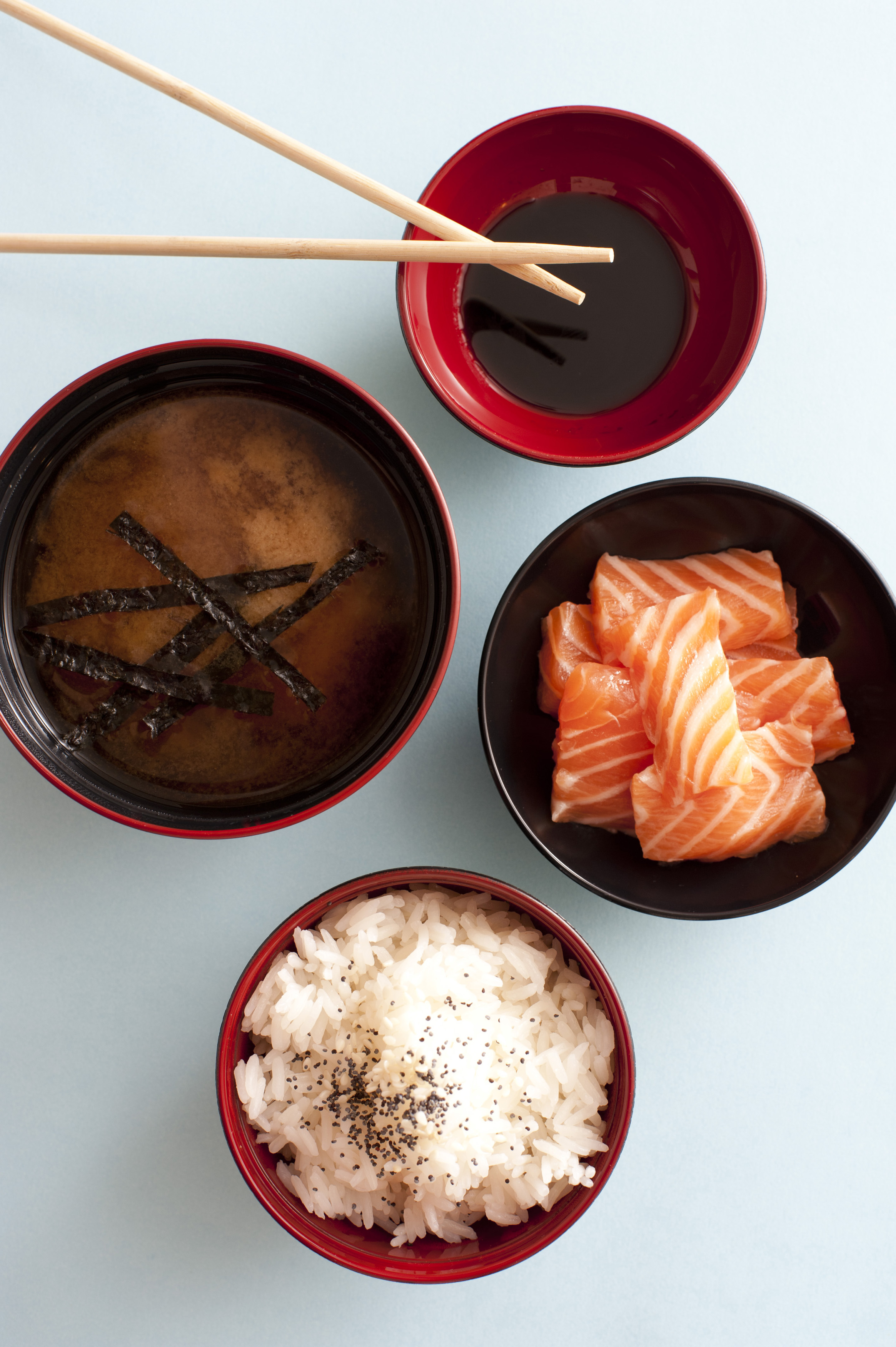 Keywords: asian, bowl, chopsticks, dish, fish, japanese, meal, raw, rice, salmon, sushi, lunch, soup, soy sauce, dinner, blue
