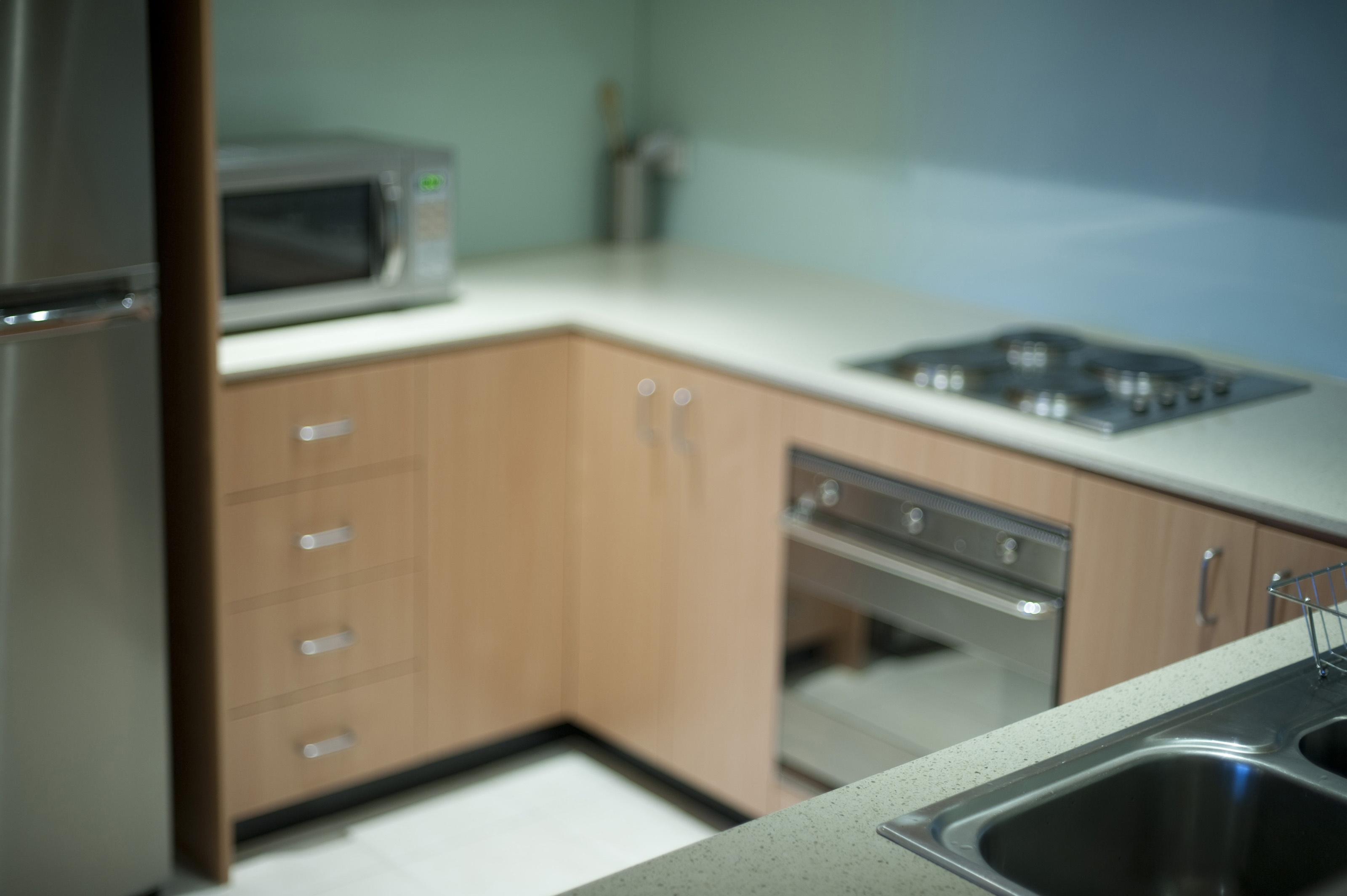Keywords: kitchen, home, architectural, design, room, interior, counter, oven, microwave, hob, cabinetry, fittings, fixtures, empty, fridge, electrical, cooking, appliances, equipment, compact