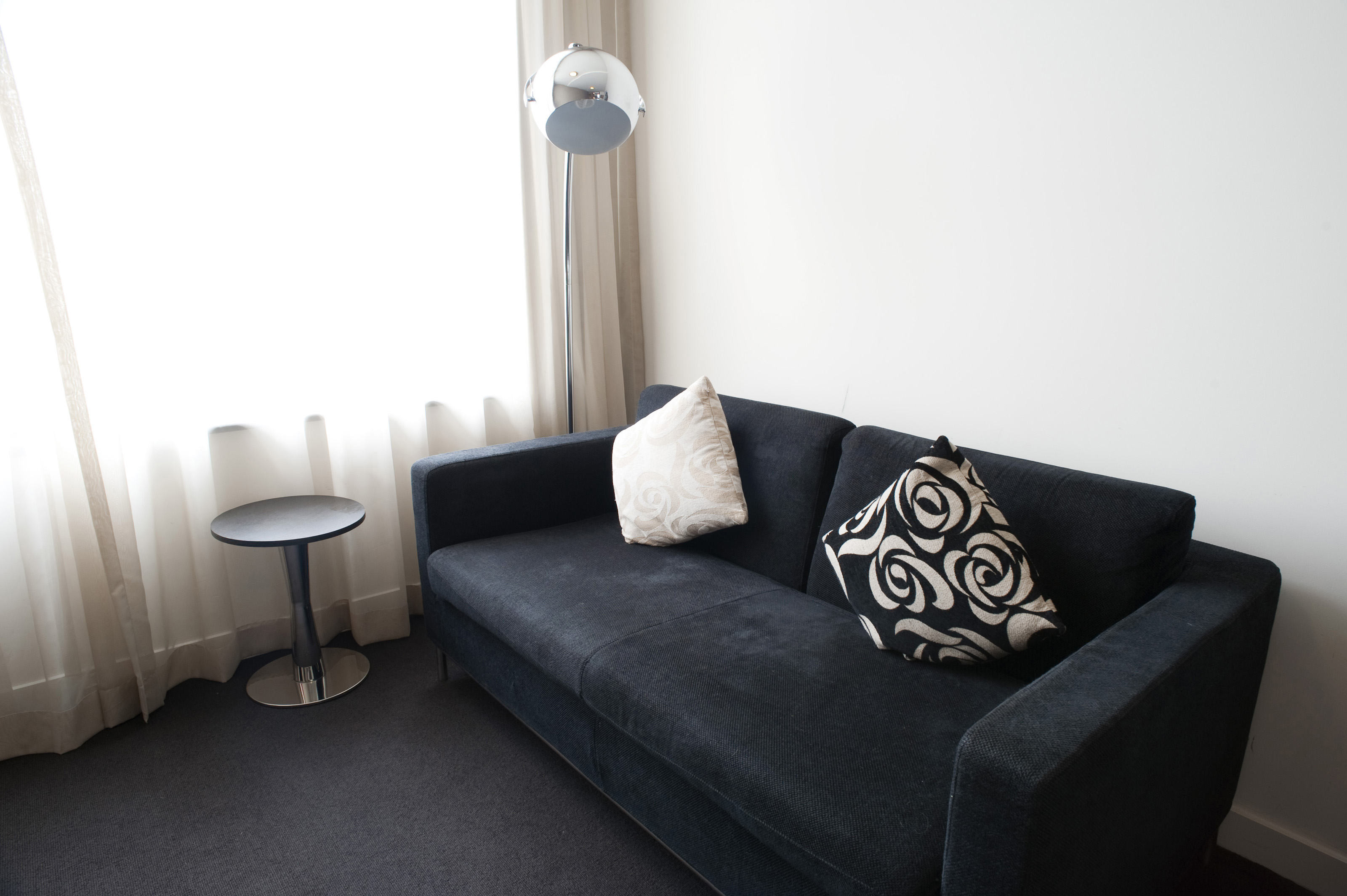 Keywords: couch, living room, lounge, settee, sofa, suite, black, modern, dark, sparce, sparse, table, bar table, round, cushion, lamp, chrome, trendy, sheer cutrains, muslin drapes, black