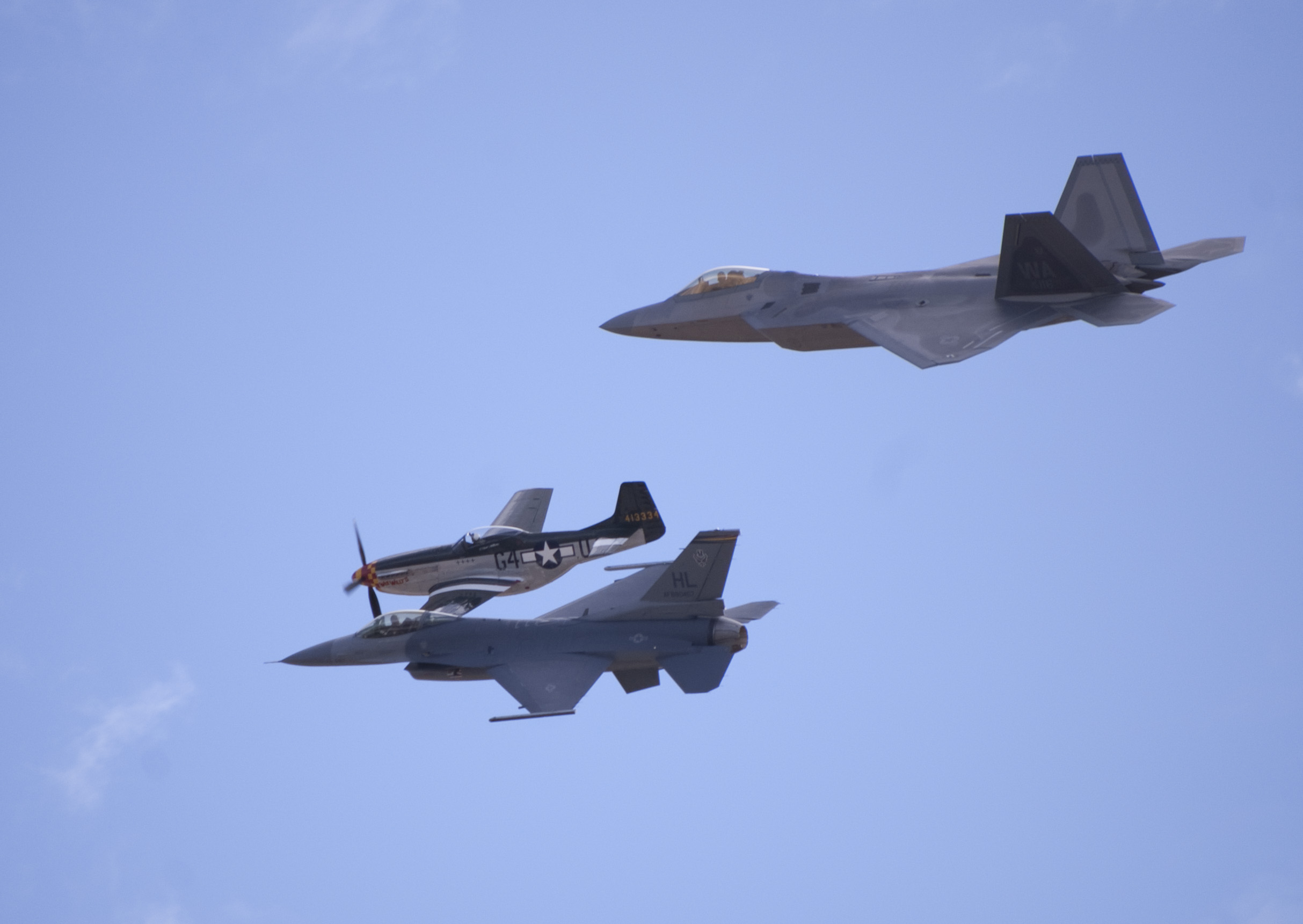 three planes in flight, an on P-51 mustang with propeller, and modern FA18 hornet and F22 raptor jet aircraft