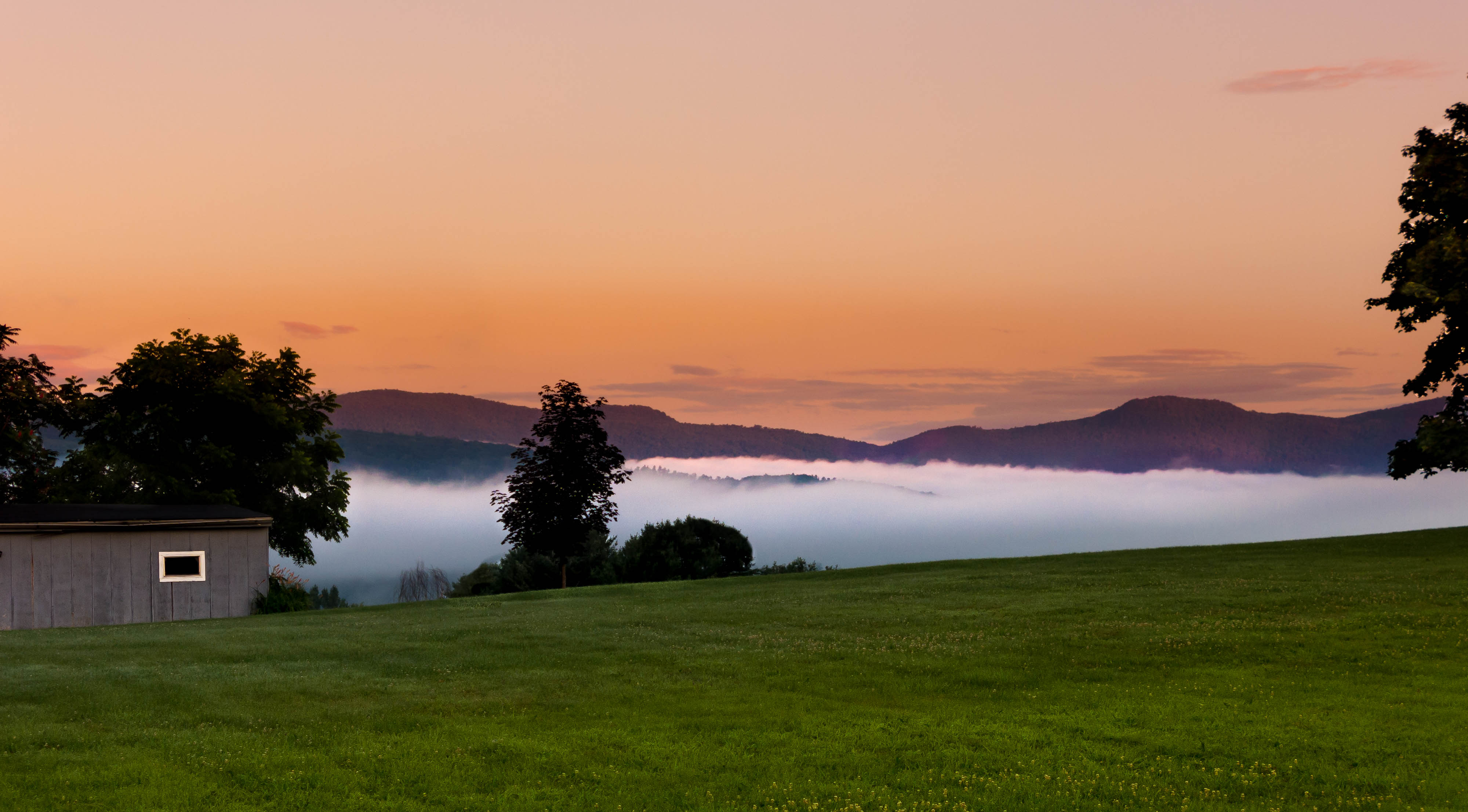 Morning fog with shed and deep valley clouds contrasting sky and green grass with trees.