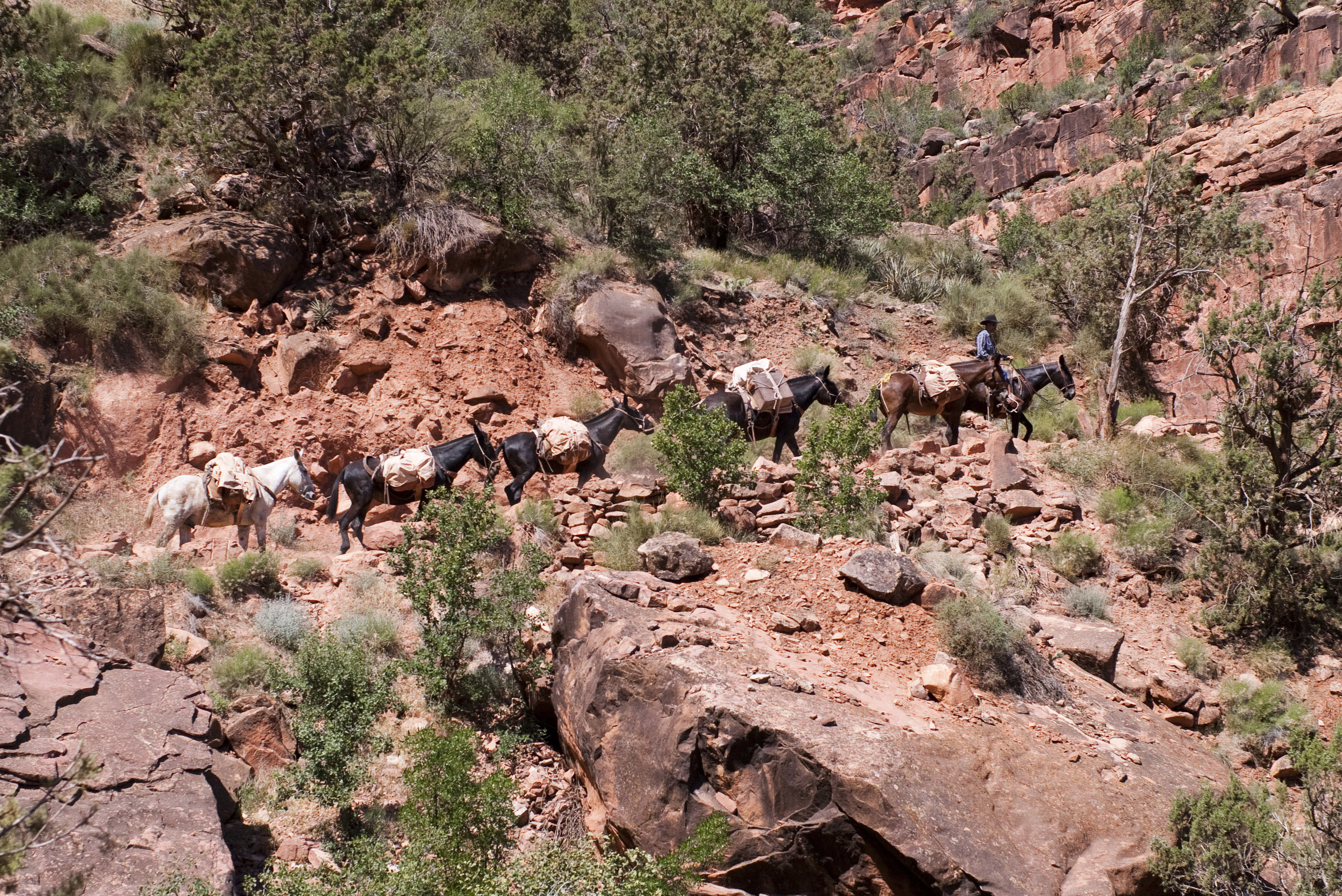 Keywords: mules, donkeys, mule, train, trail, track, line, pack horses, grand canyon, red, rocks, desert, 49ers
