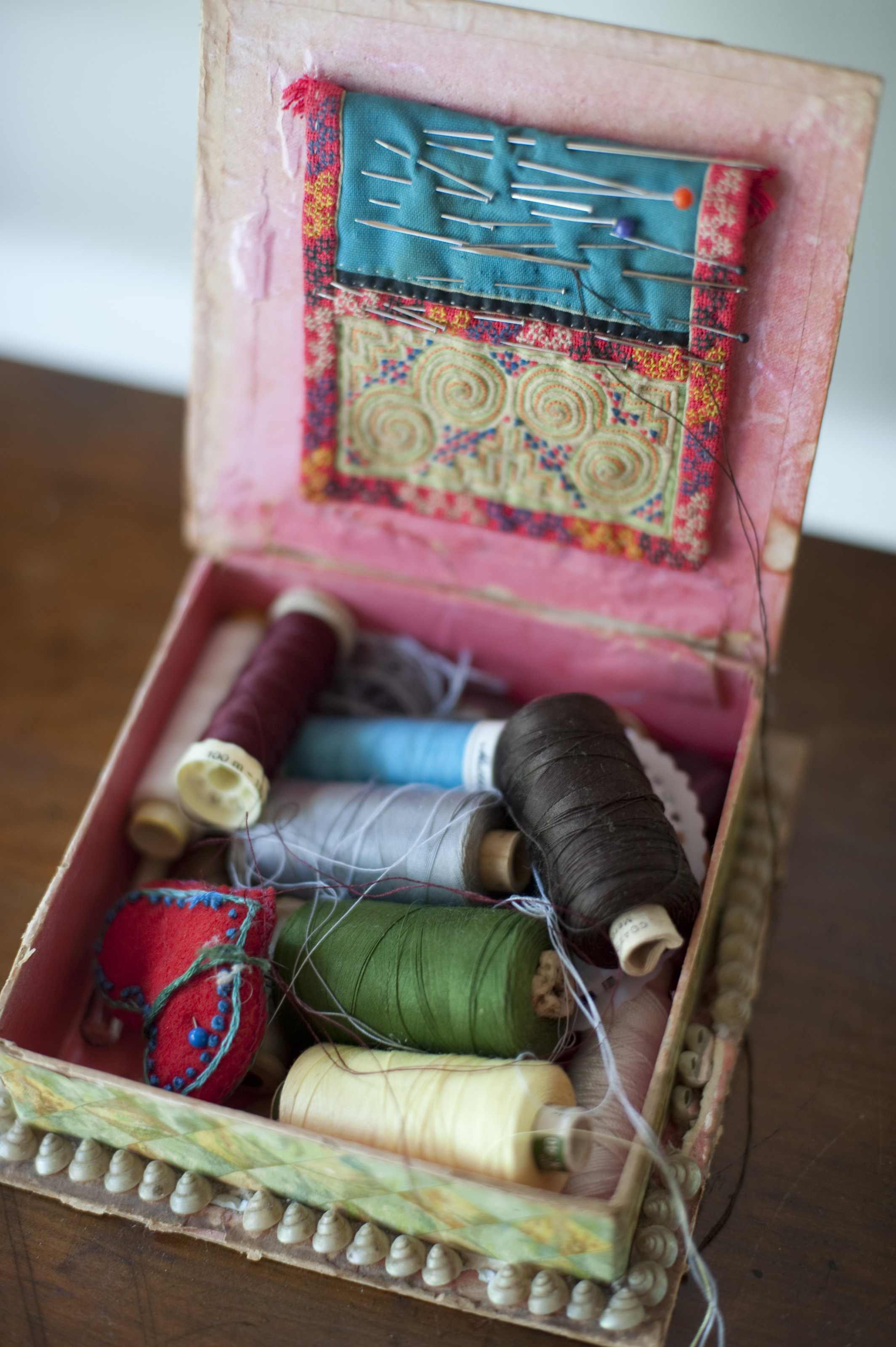 Keywords: box, colored, cotton, handicraft, needles, needlework, pins, reels, sewing, thread, yarn, craft, household, mending, chores, traditional, old