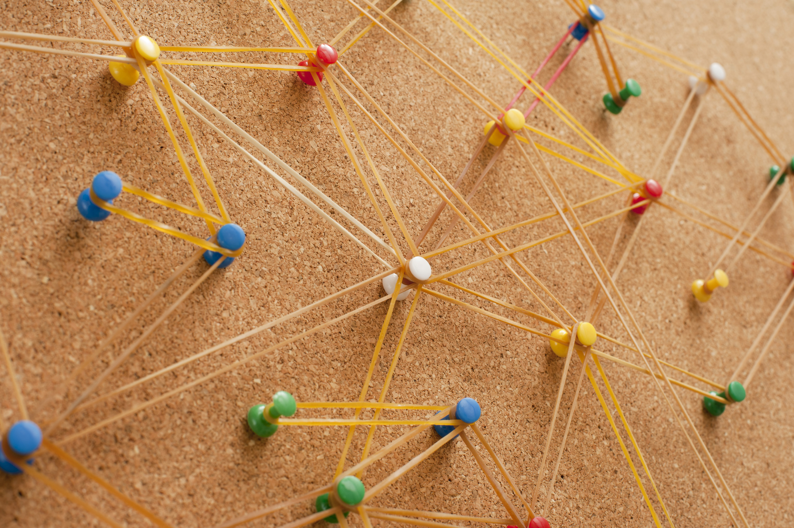 Network Concept Using Assorted Colored Pins on Cork Board Connected with Rubbers