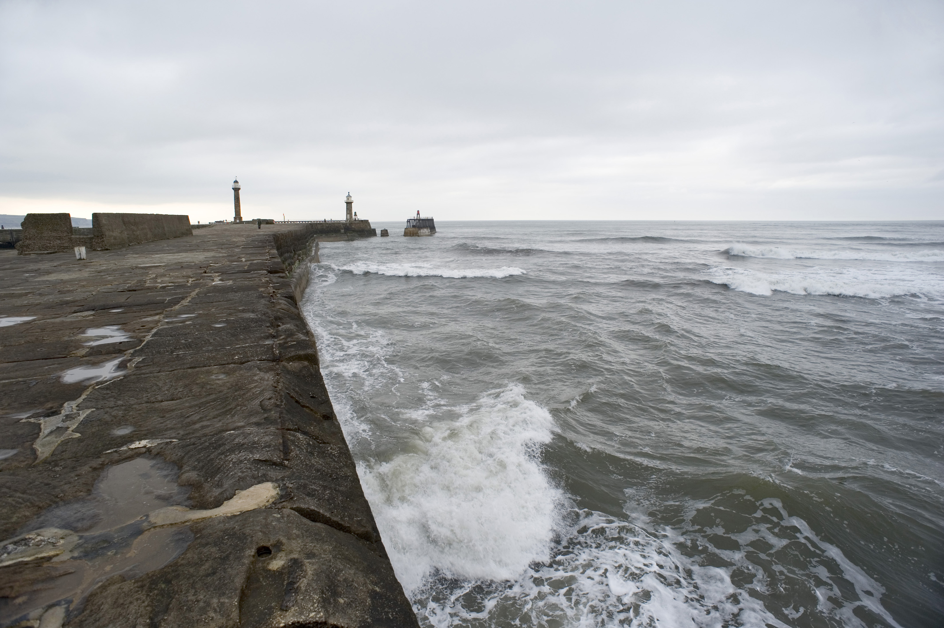Keywords: whitby, north yorkshire, england, wall, stormy, protection, waves, pier, marine, cloudy, seawall, defenses, entrance, sea, harbour, ocean, seascape, port, deserted, view