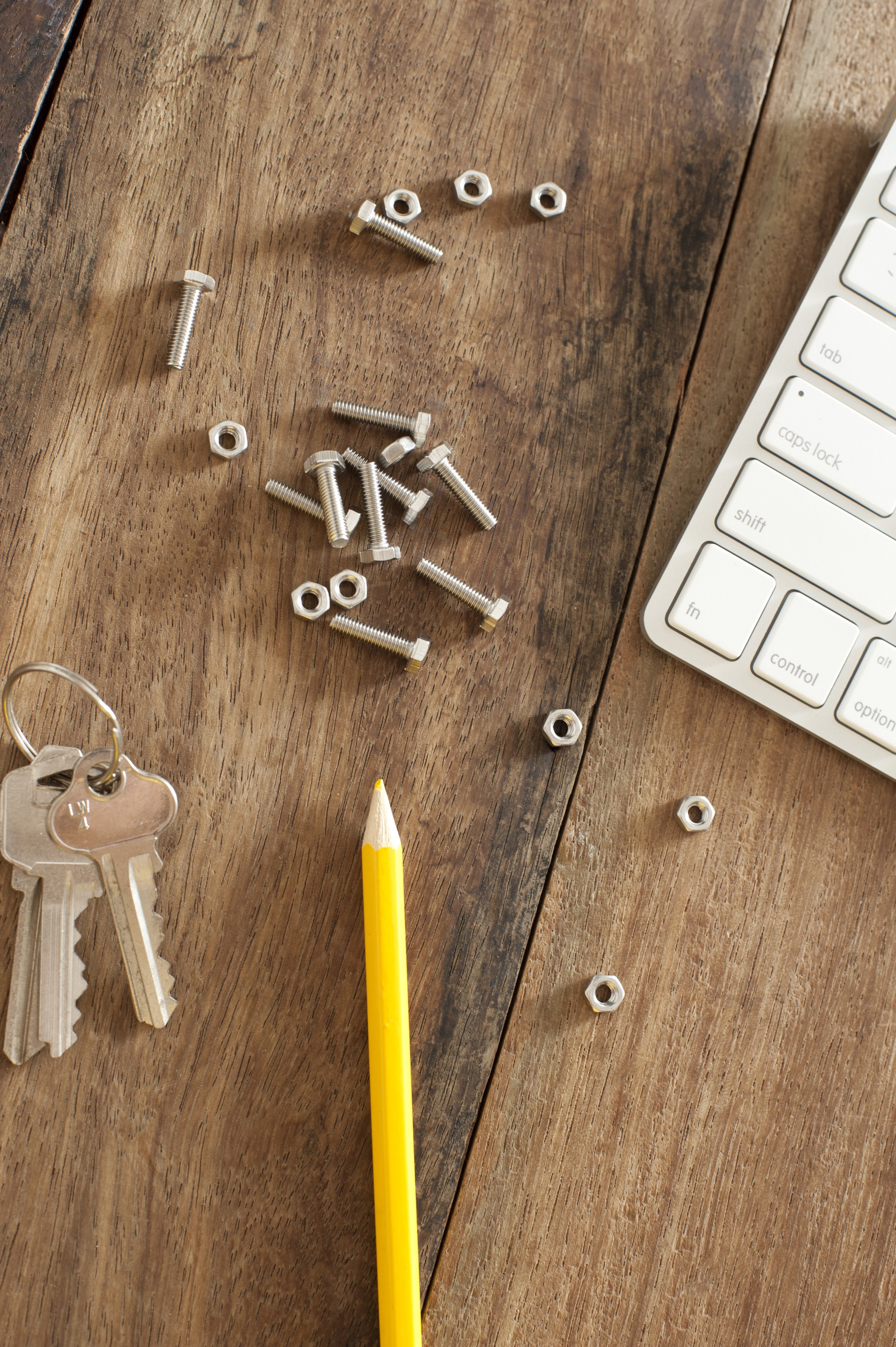 Nut and bolts lying on a wooden desk alongside a computer keyboard, pencil and keys in a conceptual image, overhead view