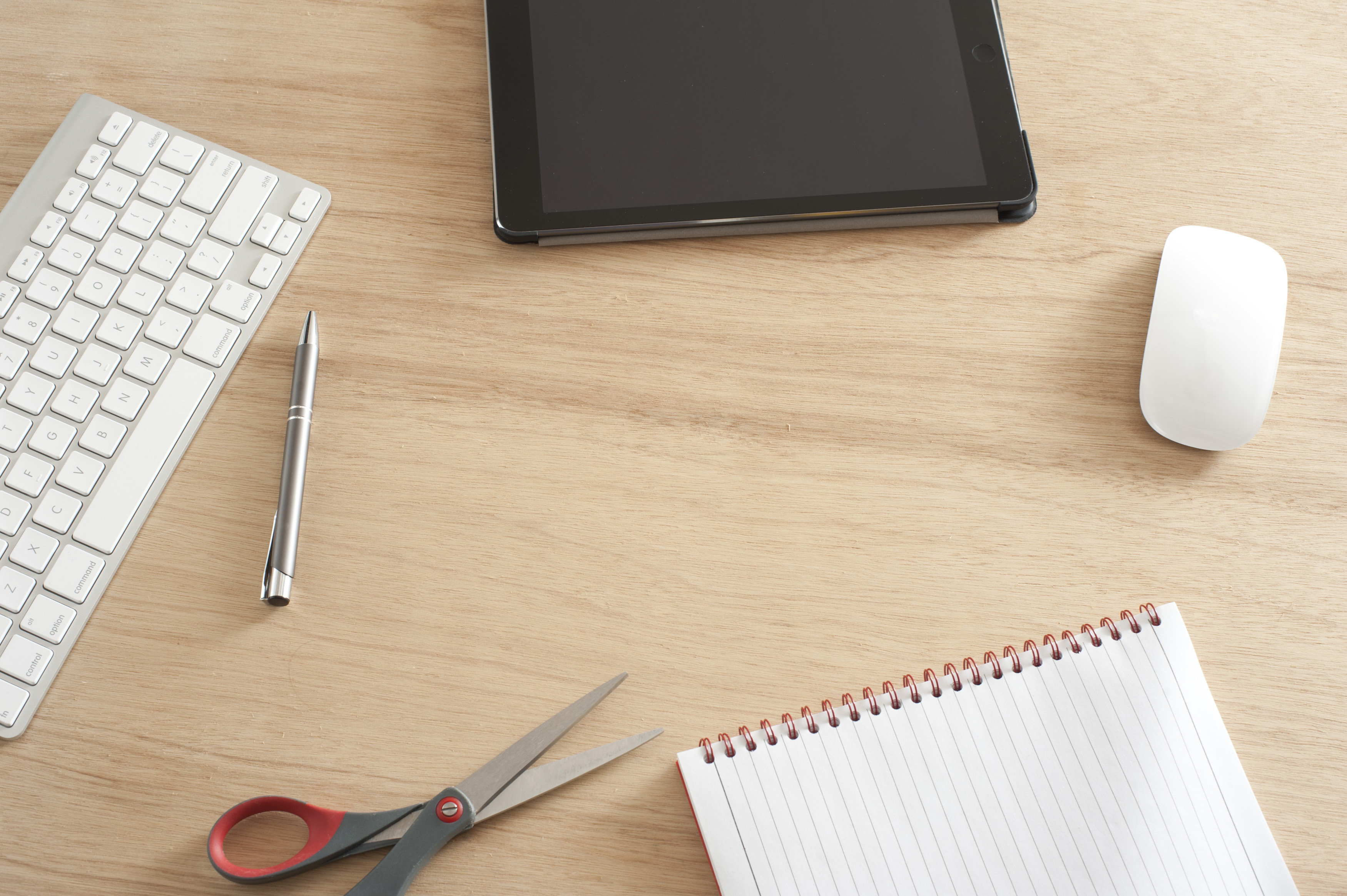 Keywords: ipad, office, modern, wooden, wireless keyboard, notepad, scissors, mouse, pen, copyspace