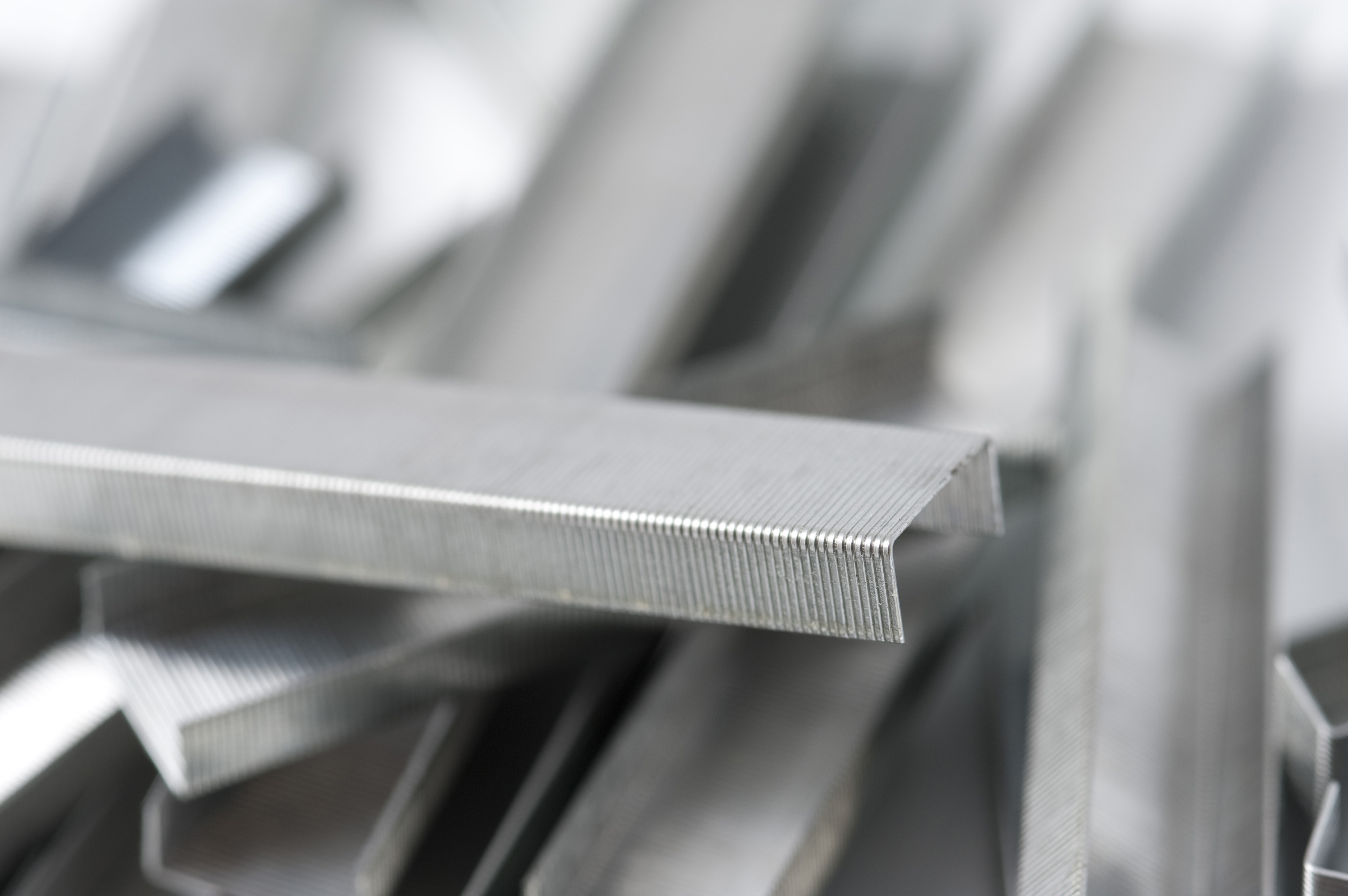 Jumbled messy wire staple background with focus to the end of one block of joined staples