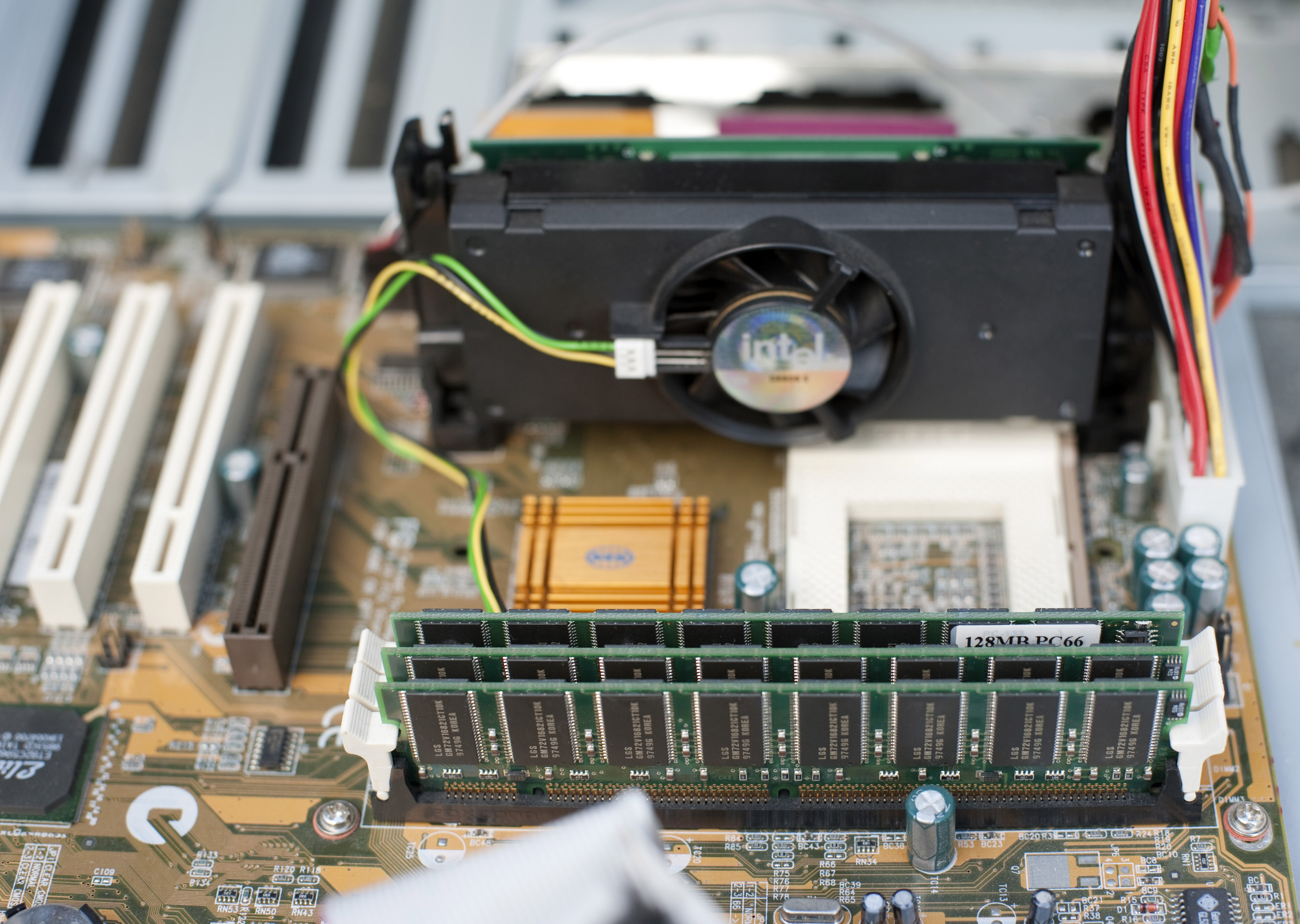 Keywords: electronics, close-up, computer, cpu, hardware, memory, motherboard, old, open case, operative, pc, personal, processor, slot, editorial, 1990s, late 90's intel, slot 1, memory dimms