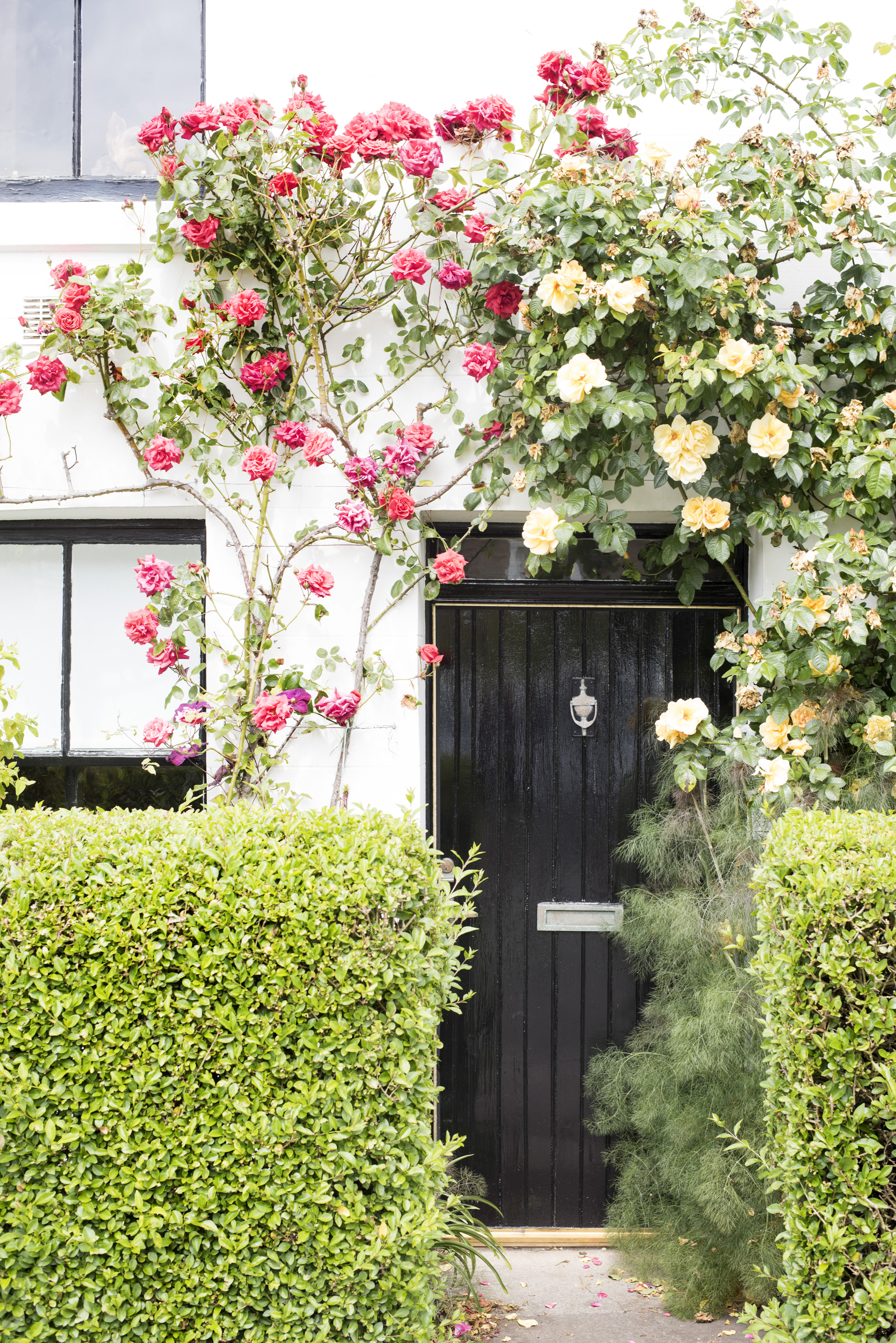 Keywords: arch, climbing, cottage, door, flowers, hedge, manicured, privet, red, roses, summer, yellow, gardening, horticulture, plant, knocker, climber